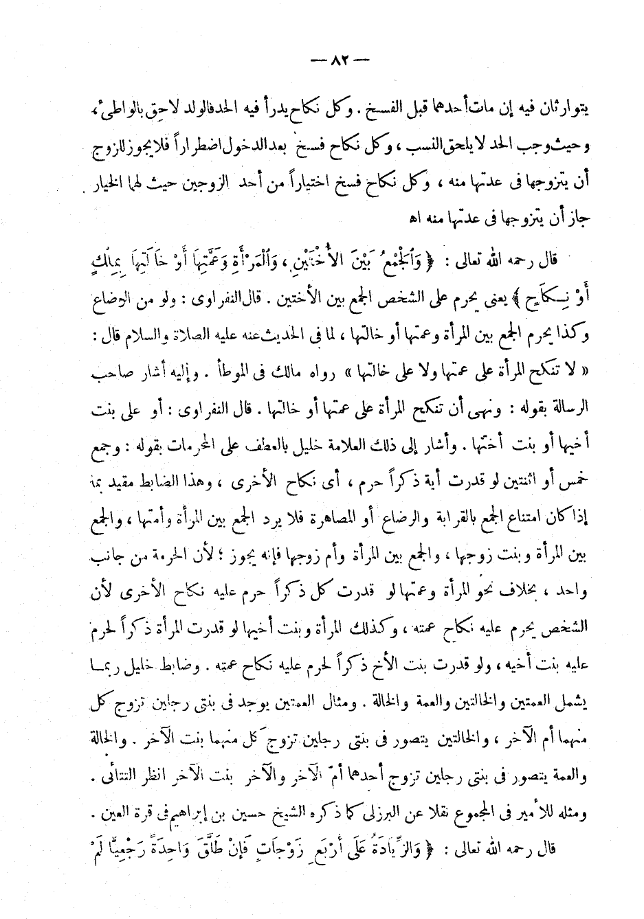 قال رحمه الله تعالى: " والجمع بين الأختين، والمرأة وعمتها أو خالتها بملك أو نكاح " يعني يحرم على الشخص الجمع بين الأختين. قال النفراوي: ولو من الرضاع وكذا يحرم الجمع بين المرأة وعمتها أو خالتها، لما في الحديث عنه عليه الصلاة والسلام قال: " لا تنكح المرأة على عمتها ولا خالتها " رواه مالك في الموطأ. وإليه أشار صاحب الرسالة بقوله: ونهى أن تنكح المرأة على عمتها أو خالتها. قال النفراوي: أو على بنت أخيها أو بنت أختها. وأشار إلى ذلك العلامة خليل بالعطف على المحرمات بقوله: وجمع خمس أو اثنتين لو قدرت أي ذكراً حرم، أي نكاح الأخرى، وهذا الضابط مقيد بما إذا كان امتناع الجمع بالقرابة والرضاع أو المصاهرة فلا يرد الجمع بين المرأة وأمتها، والجمع بين المرأة وبنت زوجها، والجمع بين المرأة وأم زوجها فإنه يجوز، لأن الحرمة من جانب واحد، بخلاف نحو المرأة وعمتها لو قدرت كل ذكراً حرم عليه نكاح الأخرى لأن الشخص يحرم عليه نكاح عمته، وكذلك المرأة وبنت أخيها لو قدرت المرأة ذكراً لحرم عليه بنت أخيه، ولو قدرت بنت الأخ ذكراً لحرم عليه نكاح عمته. وضابط خليل ربما يشمل العمتين والخالتين والعمة والخالة. ومثال العمتين يوجد في بنتي رجلين تزوج كل منهما أم الآخر، والخالتين يتصور في بنتي رجلين تزوج أحدهما أم الآخر والآخر بنت الآخر أنظر