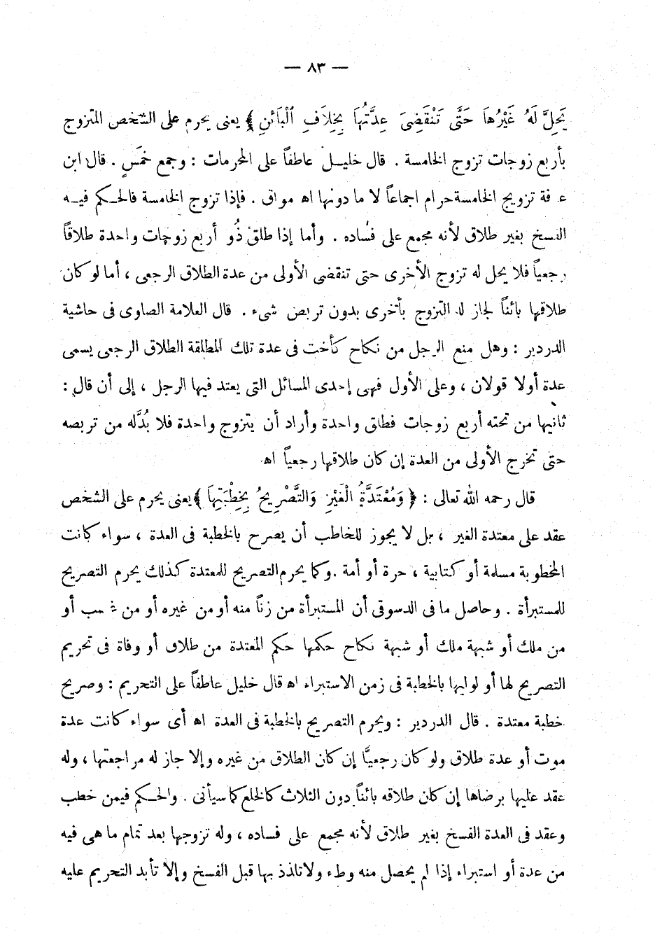 قال رحمه الله تعالى: " ومعتدة الغير والتصريح بخطبتها " يعني يحرم على الشخص عقد على معتدة الغير، بل لا يجوز للخاطب أن يصرح بالخطبة في العدة، سواء كانت المخطوبة مسلمة أو كتابية، حرة أو أمة. وكما يحرم التصريح للمعتدة كذلك يحرم التصريح للمستبرأة. وحاصل ما في الدسوقي أن المستبرأة من زناً منه أو من غيره أو من غصب أو من ملك أو شبهة ملك أو شبهة نكاح حكمها حكم المعتدة من طلاق أو وفاة في تحريم التصريح لها أو لوليها بالخطبة في زمن الاستبراء اهـ قال خليل عاطفاً على التحريم: وصريح خطبة معتدة. قال الدردير: ويحرم التصريح بالخطبة في العدة اهـ أي سواء كانت عدة موت أو عدة طلاق ولو كان رجعياً إن كان الطلاق من غيره وإلا جاز له مراجعتها، وله عقد عليها برضاها إن كان طلاقه بائناً دون الثلاث كالخلع كما سيأتي. والحكم فيمن خطب وعقد في العدة الفسخ بغير طلاق لأنه مجمع على فساده، وله تزوجها بعد تمام ما هي فيه من عدة أو استبراء إذا لم يحصل منه وطء ولا تلذذ بها قبل الفسخ وإلا تأبد التحريم عليه