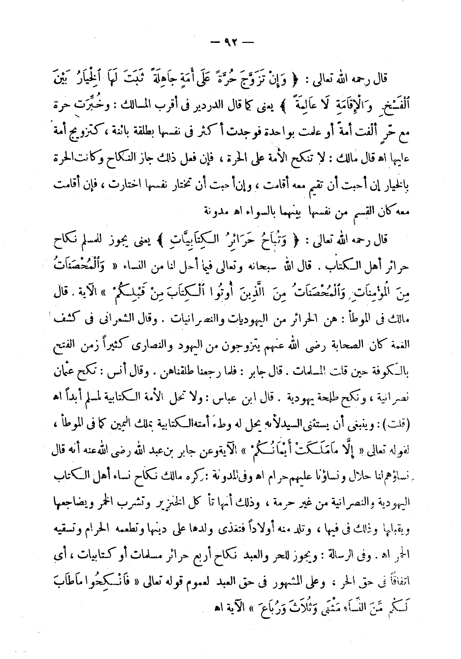 الموطأ: هن الحرائر من اليهوديات والنصرانيات. وقال الشعراني في كشف الغمة كان الصحابة، رضي الله عنهم، يتزوجون من اليهود والنصارى كثيراً زمن الفتح بالكوفة حين قلت المسلمات. قال جابر: فلما رجعنا طلقناهن. وقال أنس: نكح عثمان نصرانية، ونكح طلحة يهودية. قال ابن عباس: لا تحل الأمة الكتابية لمسلم أبداً اهـ قلت: وينبغي أن يستثنى السيد لأنه يحل له وطء أمته الكتابية بملك اليمين كما في الموطأ، لقوله تعالى: {إلا ما ملكت أيمانكم} {النساء: 24} الآية وعن جابر بن عبد الله، رضي الله عنه، أنه قال نساؤهم لنا حلال ونساؤنا عليهم حرام اهـ وفي المدونة: وكره مالك نكاح نساء أهل الكتاب اليهودية والنصرانية من غير حرمة، وذلك أنها تأكل الخنزير وتشرب الخمر ويضلجعها ويقبلها وذلك في فيها، وتلد منه أولاداً فتغذي ولدها على دينها وتطعمه الحرام وتسقيه الخمر اهـ. وفي الرسالة: ويجوز للحر والعبد نكاح أربع حرائر مسلمات أو كتابيات، أي اتفاقاً في حق الحر، وعلى المشهور في حق العبد لعموم قوله تعالى: {فانكحوا ما طاب لكم من النساء مثنى وثلاث ورباع} {النساء: 3} الآية اهـ.