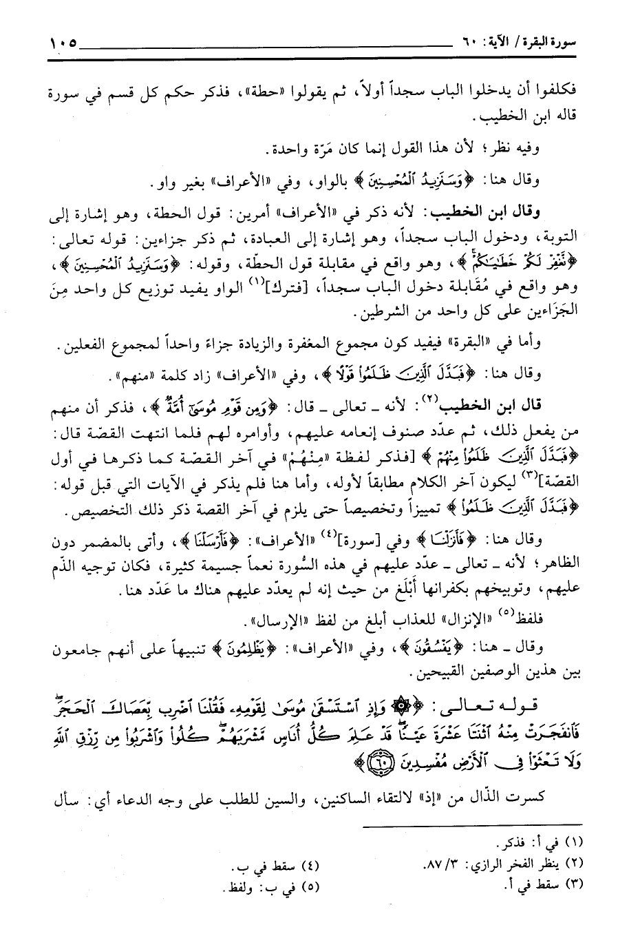 وقال ابن الخطيب: لأنه ذكر في «الأعراف» أمرين: قول الحطة، وهو إشارة إلى التوبة، ودخول الباب سجداً، وهو إشارة العبادة، ثم ذكرجزاءين: قوله تعالى: {نَّغْفِرْ لَكُمْ خَطَايَاكُمْ} ، وهو واقع في مقابلة قول الحطّة، وقوله: {وَسَنَزِيدُ المحسنين} ، وهو واقع في مُقَابلة دخول الباب سجداً، [فترك] الواو يفيد توزيع كل واحد مِنَ الجَزَاءين على كل من الشرطين.