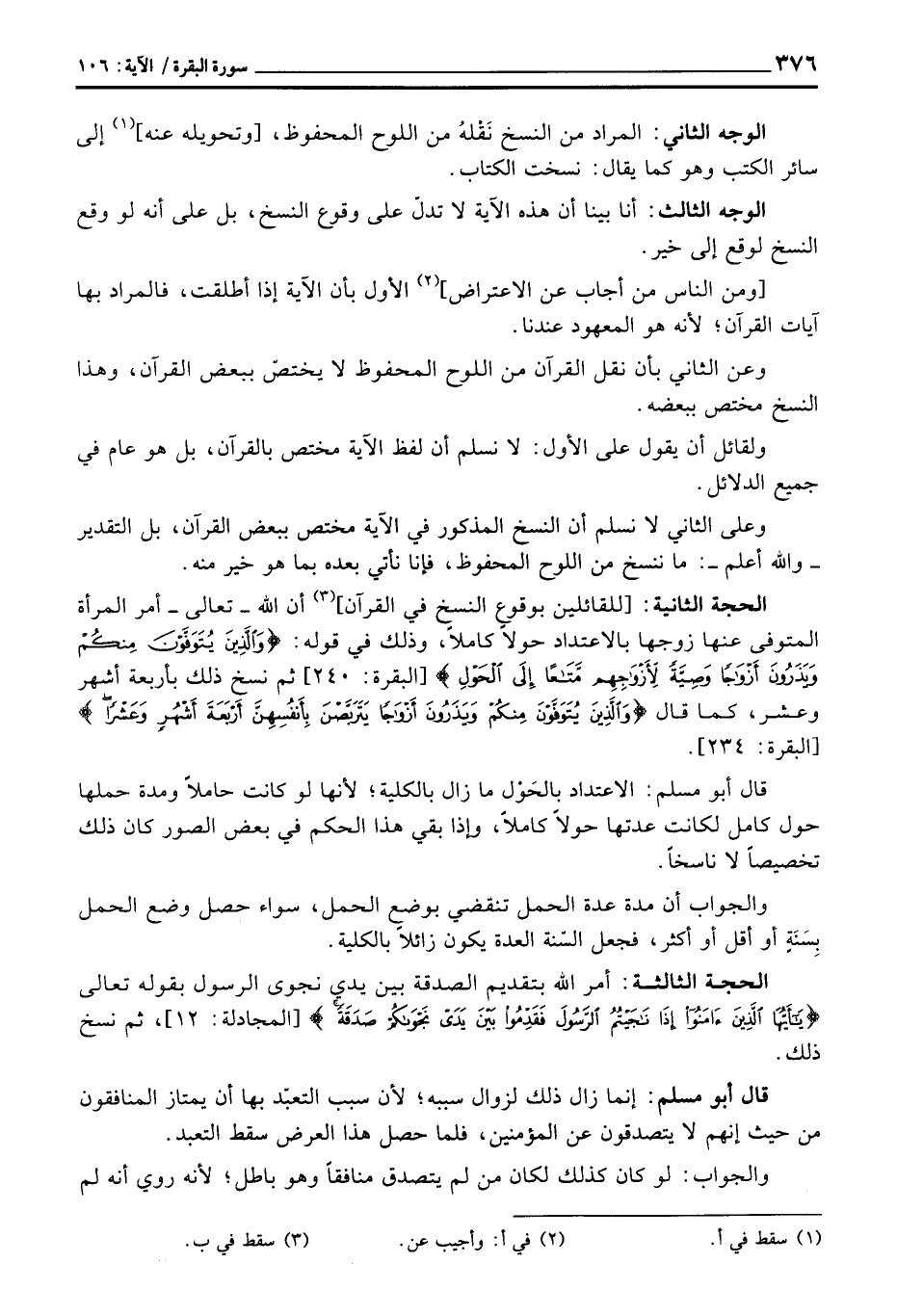 وعن الثاني بأن نقل القرآن من اللوح المحفوظ لا يختصّ ببعض القرآن، وهذا النسخ مختص ببعضه.