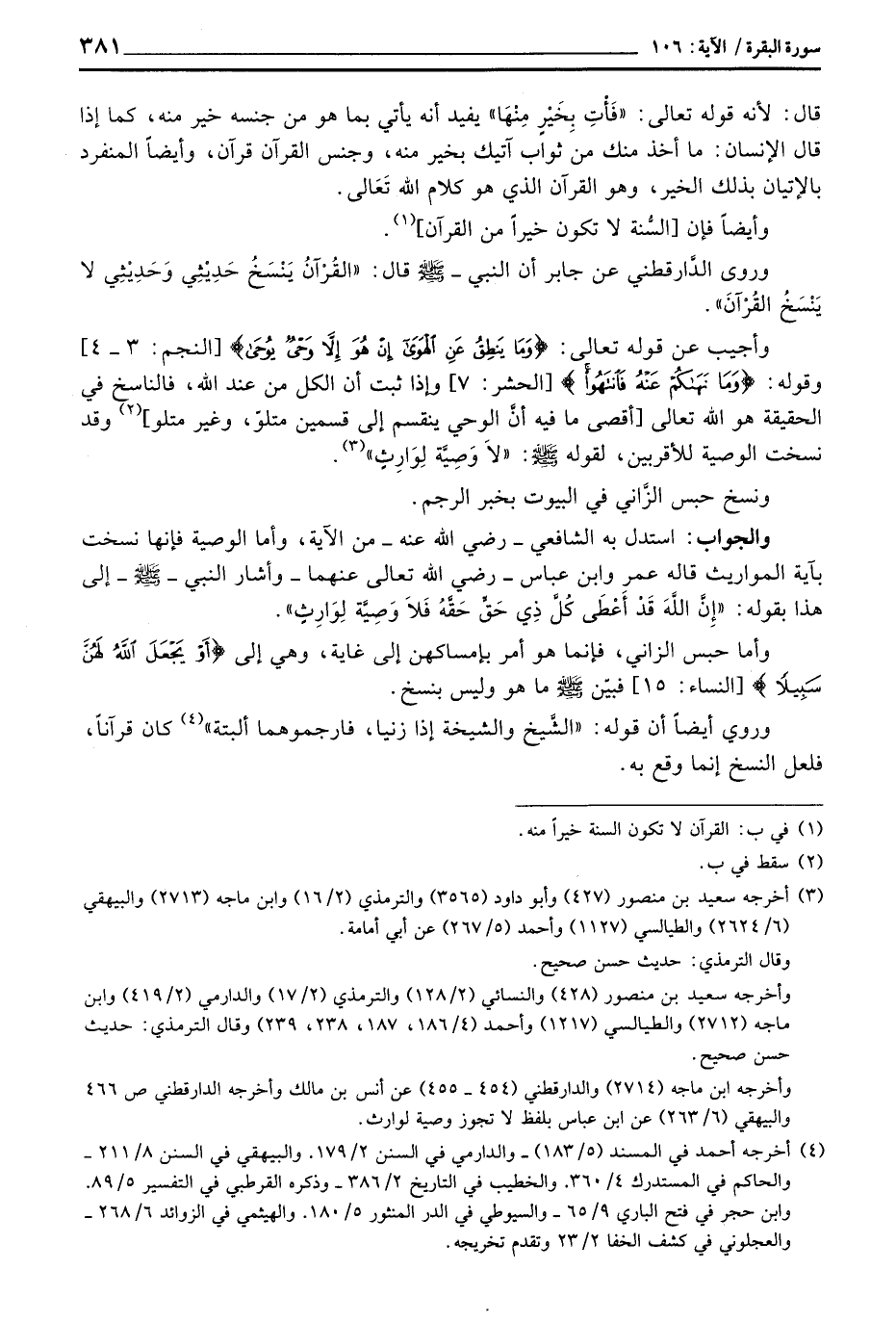 وأجيب عن قوله تعالى: {وَمَا يَنطِقُ عَنِ الهوى إِنْ هُوَ إِلاَّ وَحْيٌ يوحى} [النجم: 3 - 4] وقوله: {وَمَا نَهَاكُمْ عَنْهُ فانتهوا} [الحشر: 7] وإذا ثبت أن الكل من عند الله، فالناسخ في الحقيقة هو الله تعالى [أقصى ما فيه أنَّ الوحي ينقسم إلى قسمين متلوّ، وغير متلو] وقد نسخت الوصية للأقربين، لقوله صَلَّى الله عَلَيْهِ وَسَلَّم َ: «لاَ وَصِيَّة لِوَارِثِ» .