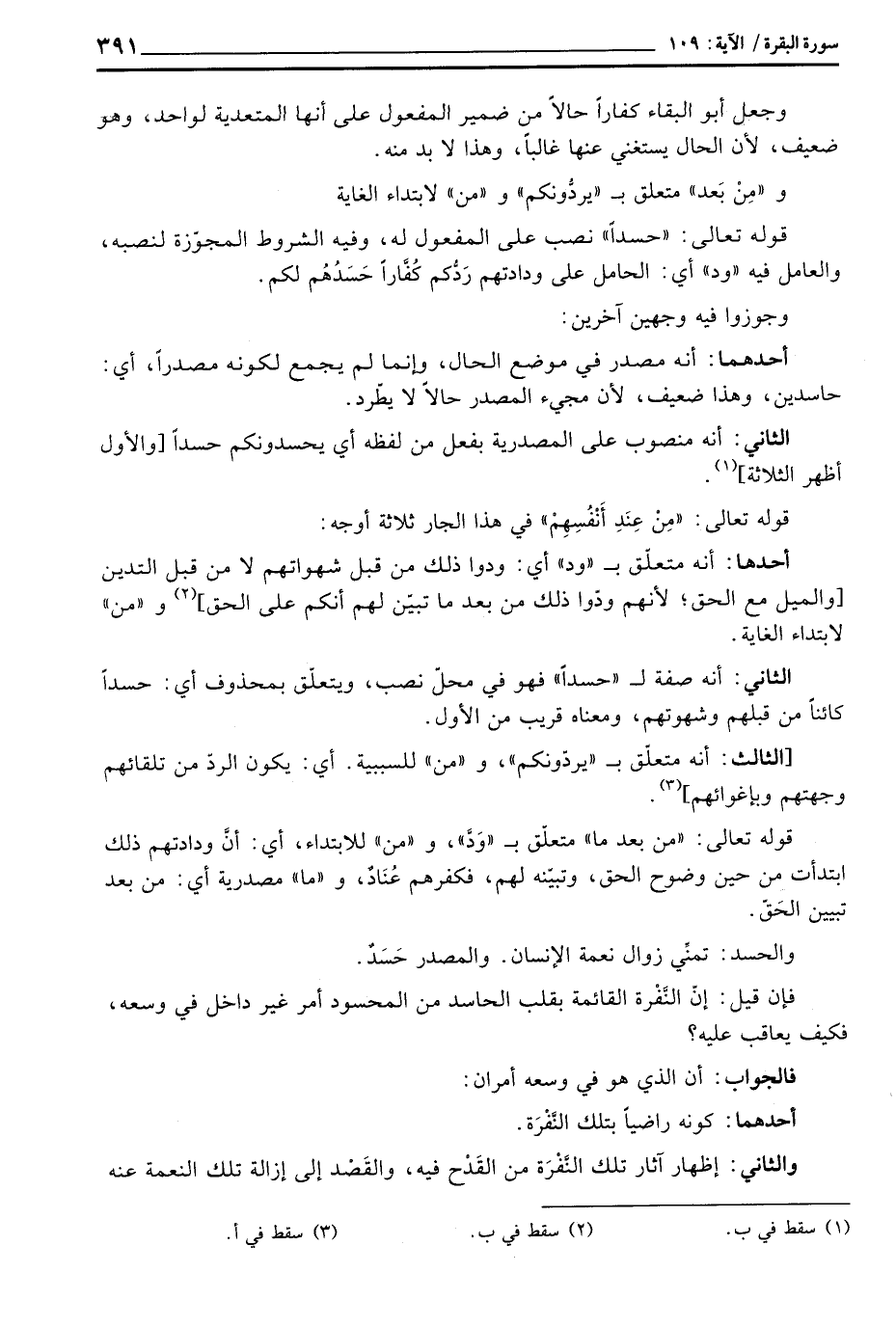 الثاني: أنه منصوب على المصدرية بفعل من لفظه أي يحسدونكم حسداً [والأول أظهر الثلاثة] .