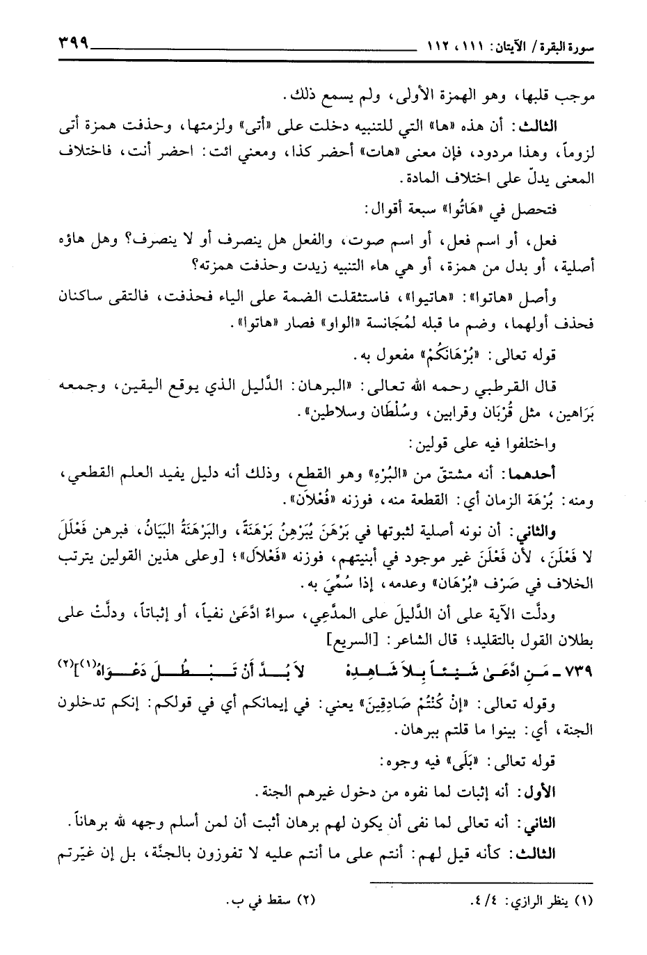 قال القرطبي رَحِمَهُ اللهُ تعالى: «البرهان» الدَّليل الذي يوقع اليقين، وجمعه بَرَاهين، مثل قُرْبَان وقرابين، وسُلْطَان وسلآطين «.