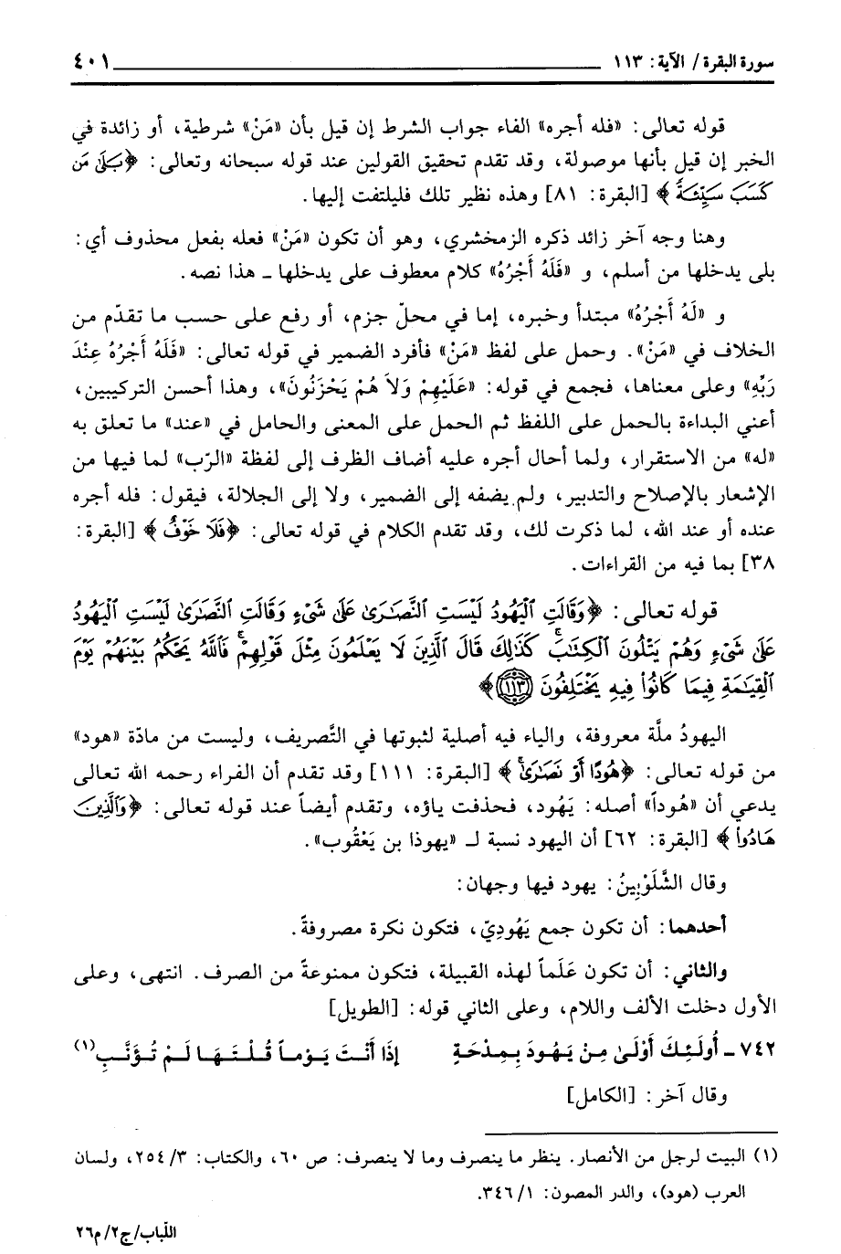 و «لَهُ أَجْرُهُ» مبتدأ وخبره، إما في محلّ جزم، أو رفع على حسب ما تقدّم من الخلاف في «مَنْ» . وحمل على لفظ «مَنْ» فأفرد الضمير في قوله تعالى: {فَلَهُ أَجْرُهُ عِندَ رَبِّهِ} وعلى معناها، فجمع في قوله: {عَلَيْهِمْ وَلاَ هُمْ يَحْزَنُونَ} ، وهذا أحسن التركيبين، أعني البداءة بالحمل على اللفظ ثم الحمل على المعنى والحامل في «عند» ما تعلق به «له» من الاستقرار، ولما أحال أجره عليه أضاف الظرف إلى لفظة «الرّب» لما فيها من الإشعار بالإصلاح والتدبير، ولم يضفه إلى الضمير، ولا إلى الجلالة، فيقول: فله أجره عنده أو عند الله، لما ذكرت لك، وقد تقدم الكلام في قوله تعالى: {فَلاَ خَوْفٌ} [البقرة: 38] بما فيه من القراءات.
