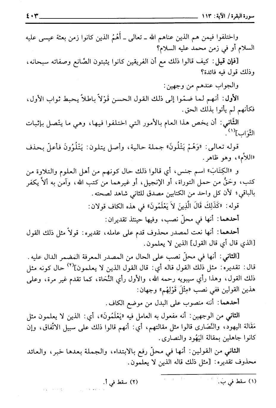 [الثاني: أنها في محلّ نصب على الحال من المصدر المعرفة المضمر الدال عليه. قال: تقديره: مثل ذلك القول قاله أي: قال القول الذين لا يعلمون] حال كونه مثل ذلك القول، وهذا رأي سيبويه رَحِمَهُ اللهُ، والأول رأي النُّحَاة، كما تقدم غير مرة، وعلى هذين القولين ففي نصب «مِثْلَ قَوْلِهم» وجهان:
