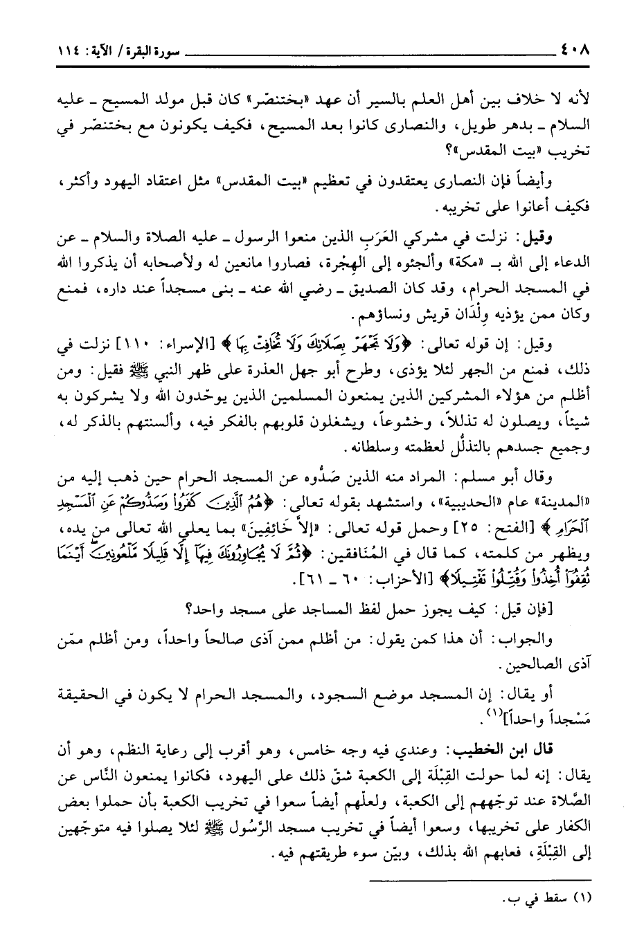 قال ابن الخطيب: وعندي فيه وجه خامس، وهو أقرب إلى رعاية النظم، وهو أن يقال: إنه لما حولت القِبْلَة إلى الكعبة شقّ ذلك على اليهودن فكانوا يمنعون النَّاس عن الصَّلاة عند توجّههم إلى الكعبة، ولعلّهم أيضاً سعةوا في تخريب الكعبة بأن حملوا بعض الكفار على تخريبها، وسعوا أيضاً في تخريب مسجد الرَّسُول صَلَّى الله عَلَيْهِ وَسَلَّم َ لئلا يصلوا فيه متوجّهين إلى القِبْلَةِ، فعابهم الله بذلكن وبيّن سوء طريقتهم فيه.