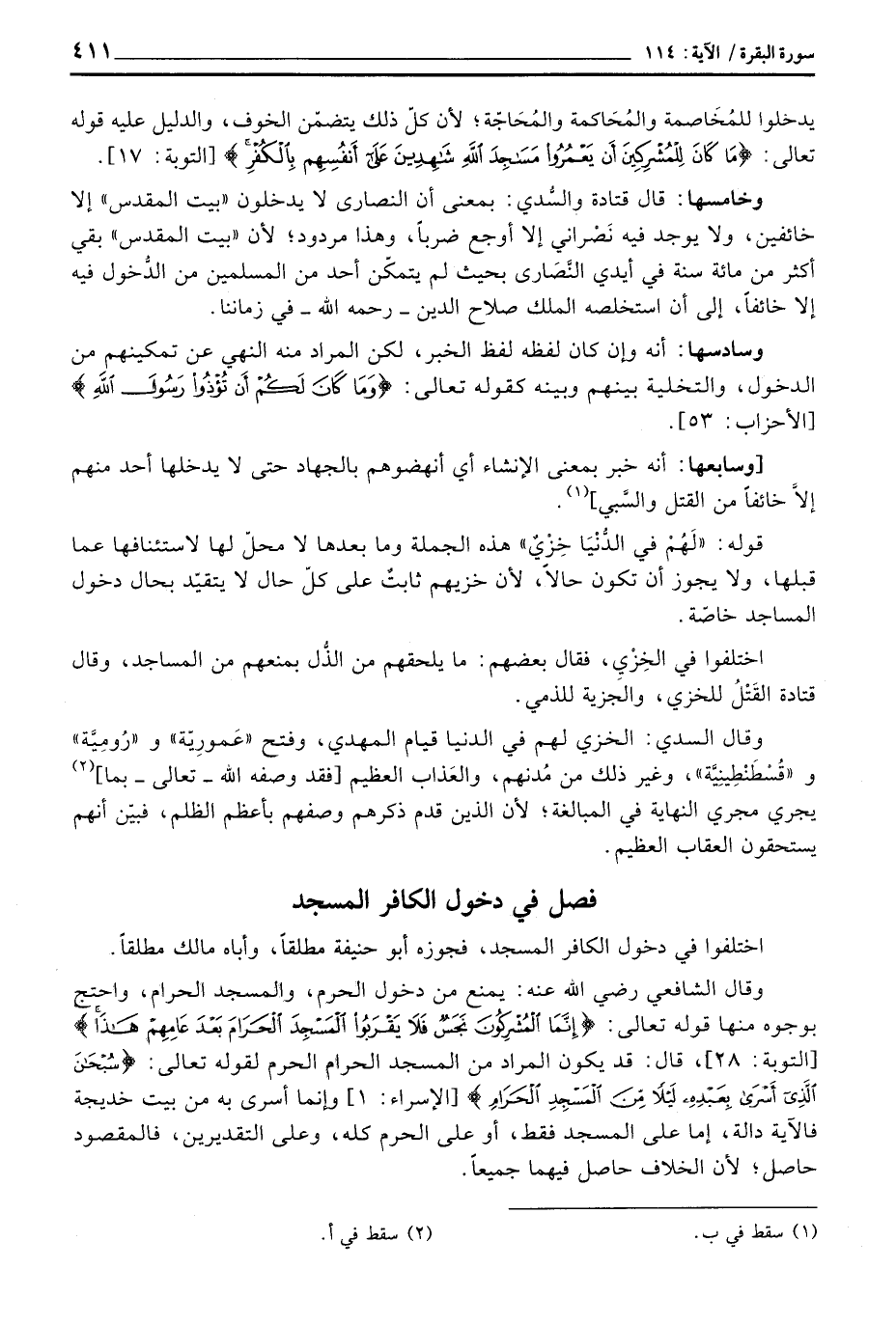 [التوبة: 28] ، قال: قد يكون المراد المسجد الحرام الحرم لقوله تعالى: {سُبْحَانَ الذي أسرى بِعَبْدِهِ لَيْلاً مِّنَ المسجد الحرام} [الإسراء: 1] وإنما أسرى به من بيت خديجة فالآية دالة، إما على المسجد فقط، أو على الحرم كله، وعلى التقديرين، فالمقصود حاصل؛ لأن الخلاف حاصل فيهما جميعاً.
