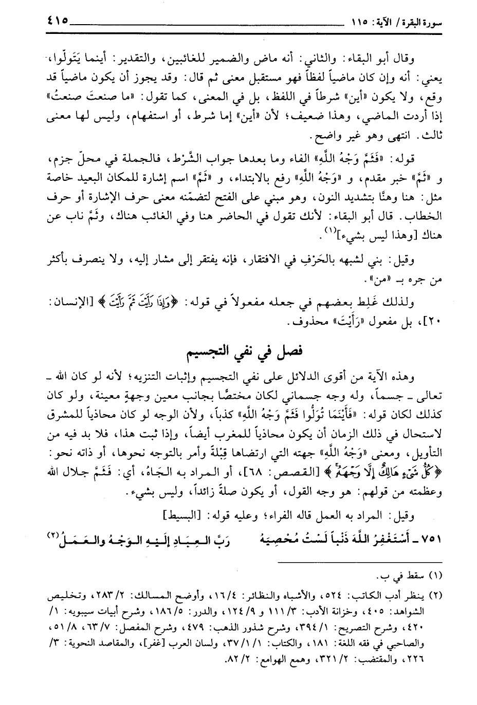 وهذه الآية من أقوى الدلائل على نفي التجسيم وإثبات التنزيه؛ لأنه لو كان الله تعالى جسماً، وله جه جسماني لكان مختصاً بجانب معين وجهةٍ معينة، ولو كان كذلك لكان قوله: {فَأَيْنَمَا تُوَلُّواْ فَثَمَّ وَجْهُ الله} كذبان ولأن الةوجه لو كان محاذياً للمشرق لاستحال في ذلك الزمان أن يكون محاذياً للمغرب أيضاً، وإذا ثبت هذا، فلا بد فيه من التأويل، ومعنى «وَجْهُ اللهِ» جهته التي ارتضاها قِبْلَةٌ وأمر بالتوجه نحوها، أو ذاته نحو: {كُلُّ شَيْءٍ هَالِكٌ إِلاَّ وَجْهَهُ} [القصص: 68] ، أو المراد به الجَاهُ، أي: فَثَمَّ جلال الله وعظمته من قولهم: هو وجه القول، أو يكون صلةً زائداً، وليس بشيء.