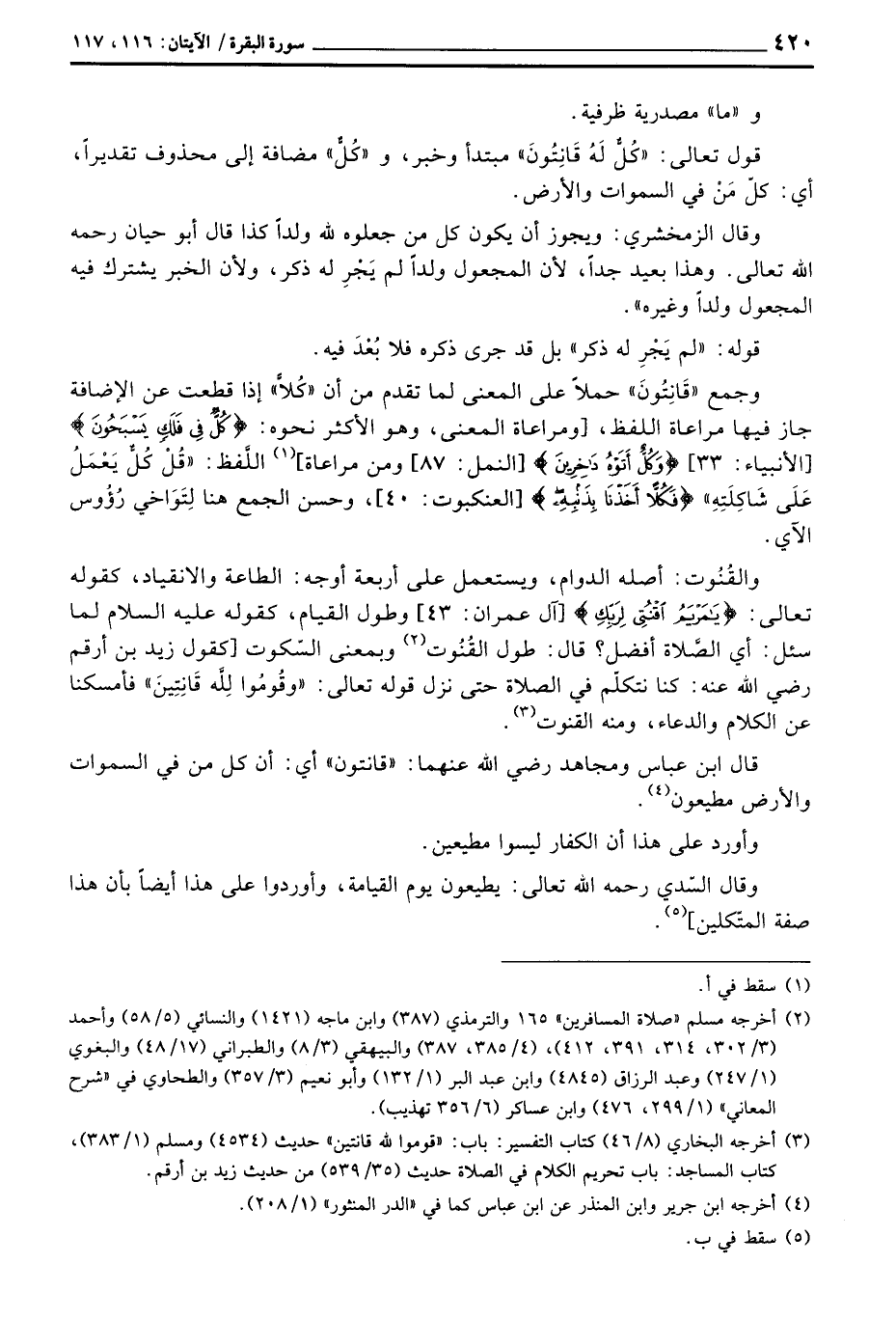 والقُنُوت: أصله الدوام، ويستعمل على أربعة أوجه: الطاعة والانقياد، كقوله تعالى: {يامريم اقنتي لِرَبِّكِ} [آل عمران: 43] وطول القيام، كقوله عليه السلام «لما سئل: أي الصَّلاة أفضل؟ قال: طول القُنُوت» وبمعنى السّكوت [كقول زيد بن أرقم رَضِيَ اللهُ عَنْه: كنا نتكلّم في الصلاة حتى نزل قوله تعالى: {وَقُومُواْ للَّهِ قَانِتِينَ} [البقرة: 238] فأمسكنا عن الكلام والدعاء، ومنه القنوت.