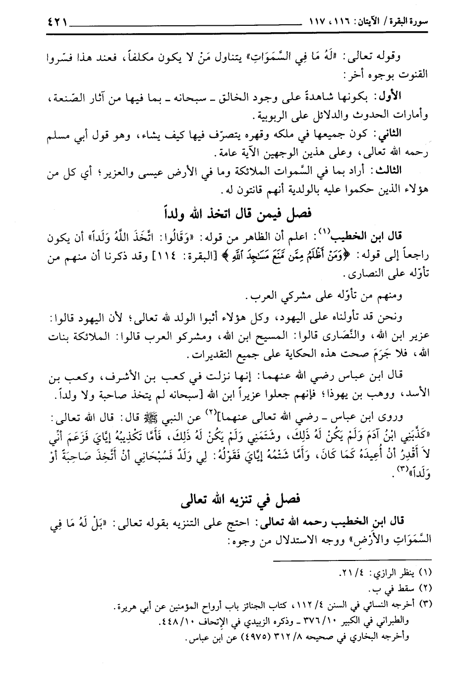 وروى ابن عباس رضي الله تعالى عنهما] عن النبي صَلَّى الله عَلَيْهِ وَسَلَّم َ قال: قال الله تعالى: «كَذَّبَنِي ابْنُ آدَمَ وَلَمْ يَكُنْ لَهُ ذَلِكَ، وشَتَمَنِي وَلَمْ يَكُنْ لَهُ ذَلِكَ، فَأَمَّا تَكْذِيبُهُ إِيَّايَ فَزَعَمَ أنِّي لاَ أََقْدِرُ أنْ أُعِيدَهُ كَمَا كَانَ، وَأَمَّا شَتْمُهُ إِيَّايَ فَقَوْلُهُ: لِي وَلَدٌ فَسُبْحَانِي أنْ أَتْخِذَ صَاحِبَةً أوْ وَلَداً» .