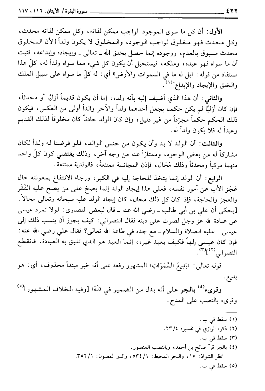 الأول: أن كل ما سوى الموجود الواجب ممكن لذاتهن وكل ممكن لذاته محدث، وكل محدث فهو مخلوق لواجب الوجود، والمخلوق لا يكون ولداً [لأن المخلوق محدث مسبوق بالعدم، ووجوده إنما حصل يخلق الله تعالى وإيجاده وإبداعه، فثبت أن ما سواه فهو عبده، وملكه، فيستحيل أن يكون كل شيء مما سواه ولداً له، كلّ هذا مستفاد من قوله: «بل له ما في السموات والأرض» أي: له كلّ ماسواه على سبيل الملك والخلق والإيجاد والإبداع] .