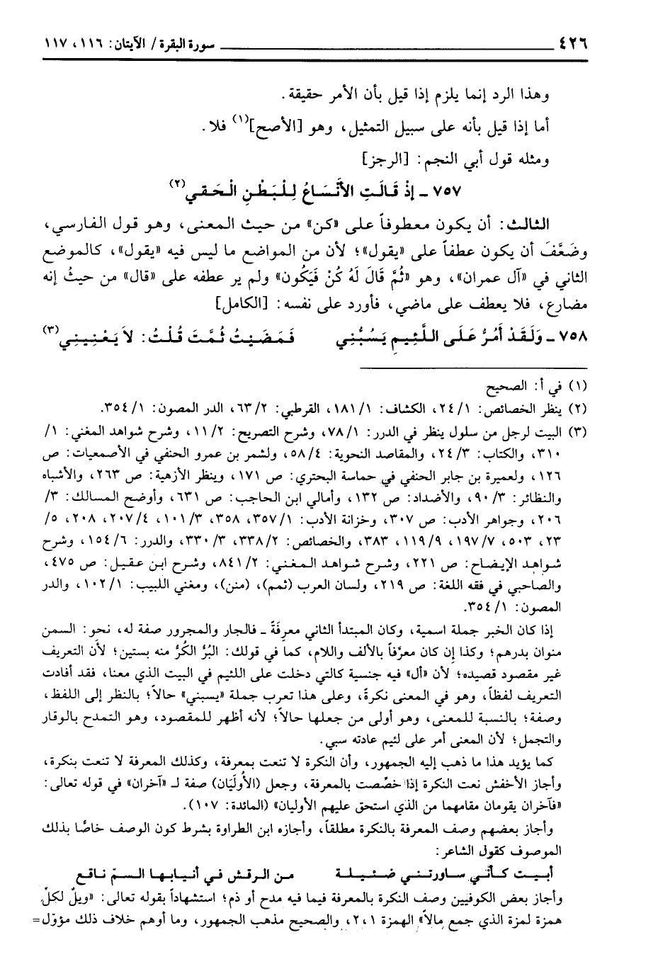 757 - إذْ قَالَتِ الأَنْسَاعُ لِلْبَطْنِ الْحَقي ... الثالث: أن يكون معطوفاً على «كن» من حيث المعنى، وهو قول الفارسي، وضَعَّفَ أن يكون عطفاً على «يقول» ؛ لأن من المواضع ما ليس فيه «يقول» كالموضع الثاني في «آل عمران» ، وهو «ثُمَّ قَالَ لَهُ كُنْ فَيَكُون» ولم ير عطفه على «قال» من حيثُ إنه مضارعن فلا يعطف على ماضي، فأورد على نفسه: [الكامل]