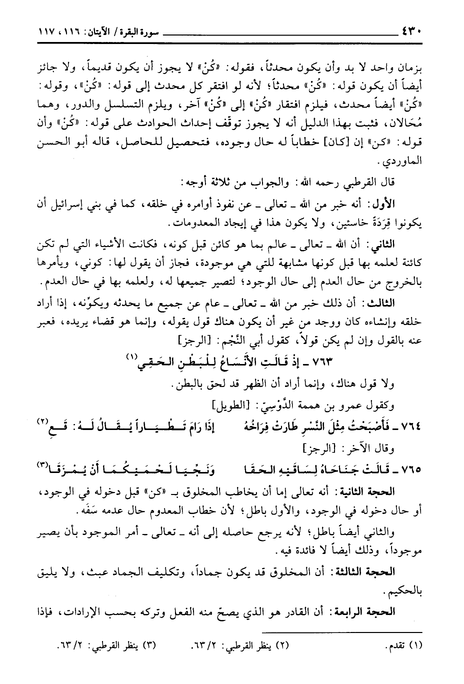 بزمان واحد لا بد وأن يكون محدثاً، فقوله: «كُنْ» لا يجوز أن يكون قديماًن ولا جائز أيضاً أن يكن قوله: «كُنْ» محدثاُ؛ لأنه لو افتقر كل محدث إلى قوله: «كُنْ» ، وقوله «كُنْ» أيضاً محدث، فيلزم افتقار «كُنْ» إلى «كُنْ» آخر، ويلزم التسلسل والدور، وهما مُحَالان، فثبت بهذا الدليل أنه لا يجوز توقّف إحداث الحوادث على قوله: «كُنْ» وأن قوله: «كن» إن [كان] خطاباً له حال وجوده، فتحصيل للحاصل، قاله أبو الحسن الماوردي.