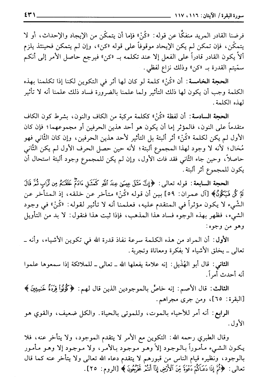 الحجة السادسة: أن لفظة «كُنْ» ككلمة مركبة من الكاف والنون، بشرط كون الكاف متقدماً على النونن فالمؤثر إما أن يكون هو أحد هذين الحرفين أو مجموعهما؛ فإن كان الا ل لم يكن لكلمة «كُنْ» أثر البتة بل التأثير لأحد هذه الحرفينن وإن كان الثَاني فهو مُحَال؛ لأنه لا وجود لهذا المجموع ألبتة؛ لأنه حين حصل الحرف الأول لم يكن الثَّاني حاصلاًُ، حين جاء الثَّاني فقد فات الأولن وإن لم يكن للمجموع وجود ألبتة استحال أن يكون للمجموع أثر ألبتة.