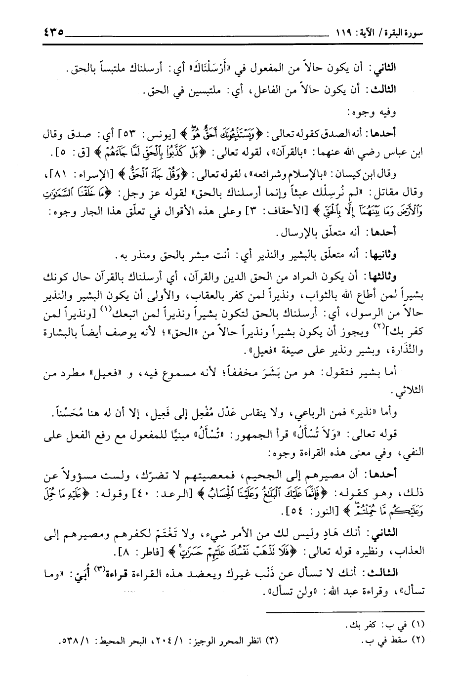 وثالثها: أن يكون المراد من الحق الدين والقرآن، أي أرسلناك بالقرآن حال كونك بشيراً لمن أطاع الله بالثواب، ونذيراً لمن كفر بالعقاب، والأولى أن يكون البشير والنذير حالاً من الرسول، أي: أرسلناك بالحق لتكون بشيراً ونذيراً لمن اتبعك [ونذيراً لمن كفر بك] ويجوز أن يكون بشيراً ونذيراً حالاً من «الحق» ؛ لأنه يوصف أيضاً بالبشارة والنَّذَارة، وبشير ونذير على صيغة «فعيل» .