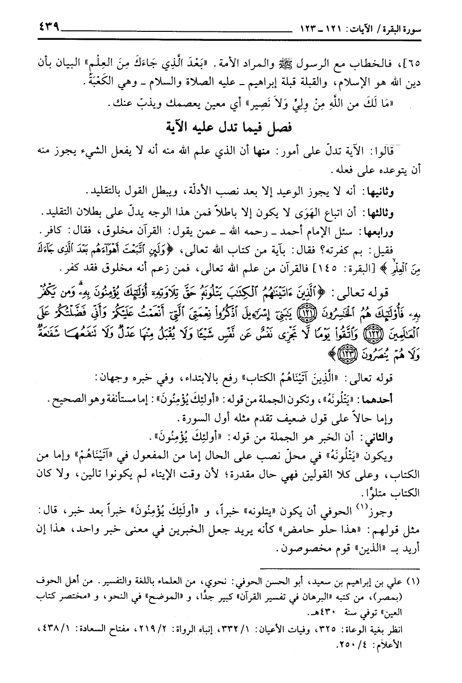 وجوز الحوفي أن يكون «يتلونه» خبراً، و «أولَئِكَ يُؤْمِنُونَ» خبراً بعد خبر، قال: مثل قولهم: «هذا حلو حامض» كأنه يريد جعل الخبرين في معنى واحد، هذا إن أريد ب «الذين» قوم مخصوصون.