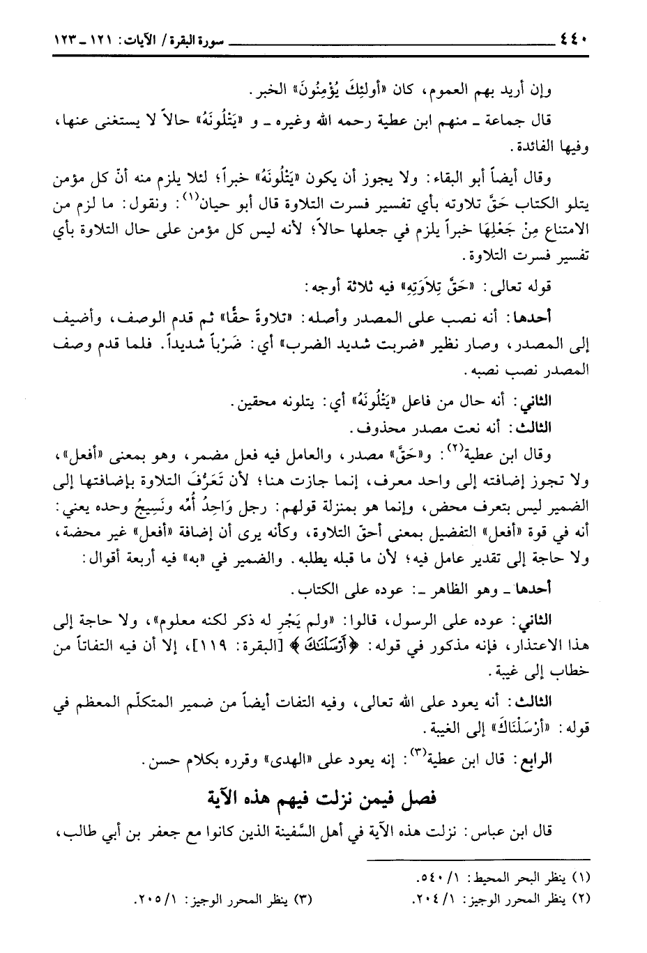 وقال أيضاً أبو البقاء: ولا يجوز أن يكون «يَتْلُونَهُ» خبراً؛ لئلا يلزم منه أنّ كل مؤمن يتلو الكتاب حَقَّ تلاوته بأي تفسير فسرت التلاوة قال أبو حيان: ونقول: ما لزم من الامتناع مِنْ جَعْلِهَا خبراً يلزم من جعلها حالاً؛ لأنه ليس كل مؤمن على حال التلاوة بأي تفسير فسرت التلاوة.