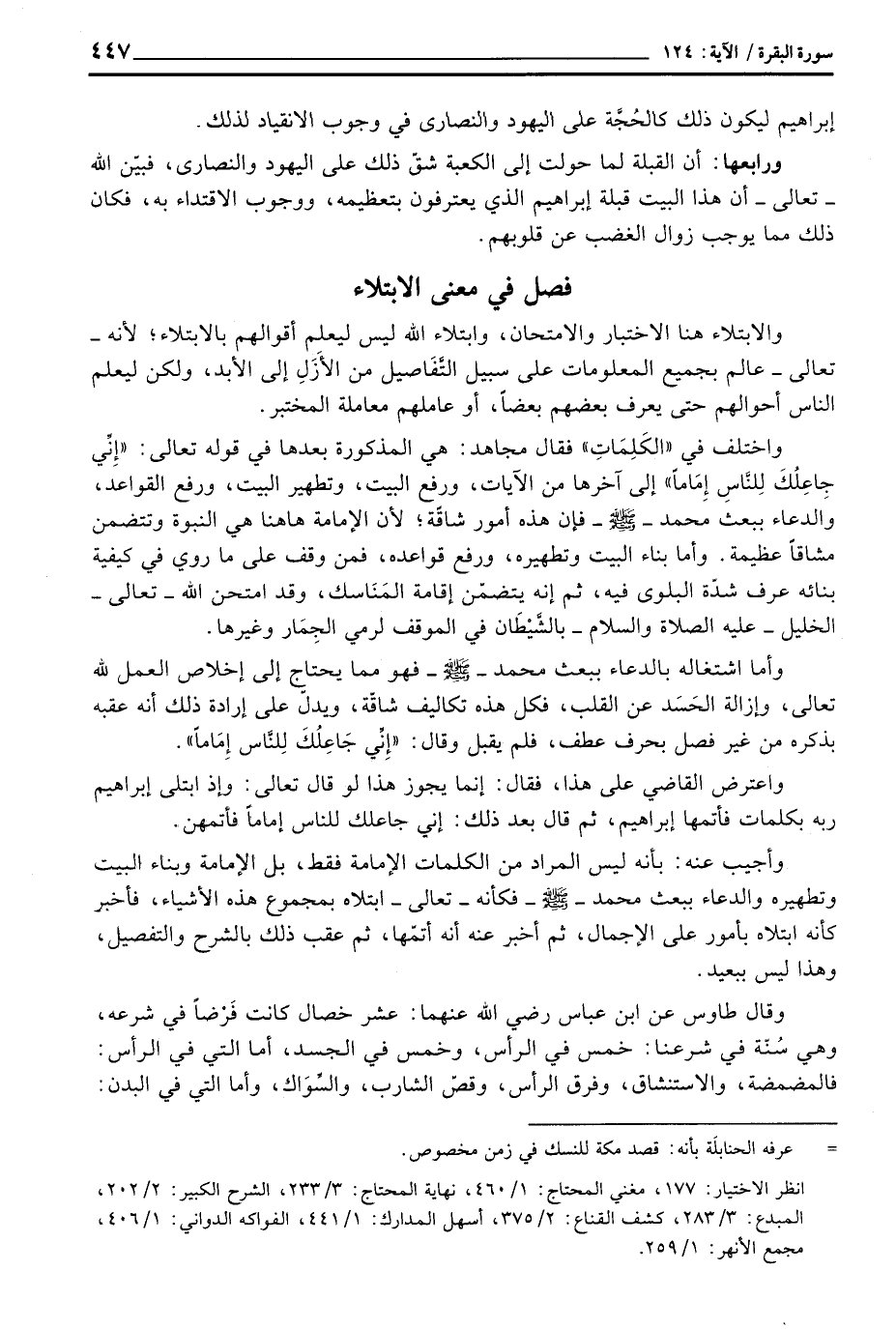 وختلف في «الكَلِمَاتِ» فقال مجاهد: هي المذكورة بعدها في قوله تعالى: {إِنِّي جَاعِلُكَ لِلنَّاسِ إِمَاماً} إلى آخرها من الآيات، ورفع البيت، وتطهير البيت، ورفع القواعد، والدعاء ببعث محمد صَلَّى الله عَلَيْهِ وَسَلَّم َ فإن هذه أمور شاقّة؛ لأن الإمامة هاهنا هي النبوة وتتضمن مشاقاً عظيمة. وأما بناء البيت وتطهيره، ورفع قواعده، فمن وقف على ما روي في كيفية بنائه عرف شدّة البلوى فيه، ثم إنه يتضمّن إقامة المَنَاسك، وقد امتحن الله تعالى الخليل عَلَيْهِ الصَّلَاة وَالسَّلَام ُ بالشَّيْطَان في الموقف لرمي الجِمَار وغيرها.