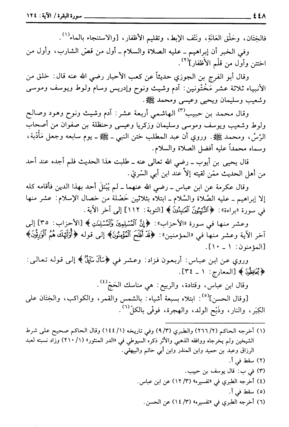 وقال عكرمة عن ابن عباس رَضِيَ اللهُ عَنْهما لم يُبْتلَ أحد بهذا الدين فأقامه كله إلا إبراهيم عليه الصَّلاة والسَّلام ابتلاه بثلاثين خَصْلة من خصال الإسلام: عشر منها في سورة «براءة» : {التائبون العابدون} [التوبة: 112] إلى آخر الآية.