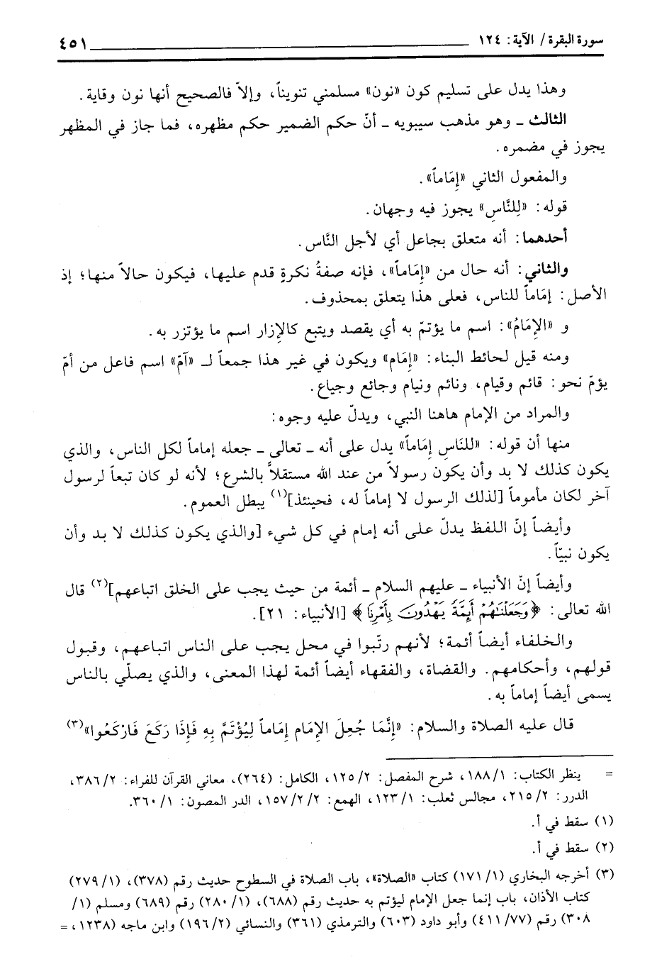 وأيضاً إنّ الأنبياء عليهم السلام أئمة من حيث يجب على الخلق اتباعهم] قال الله تعالى: {وَجَعَلْنَاهُمْ أَئِمَّةً يَهْدُونَ بِأَمْرِنَا} [الأنبياء: 21] .