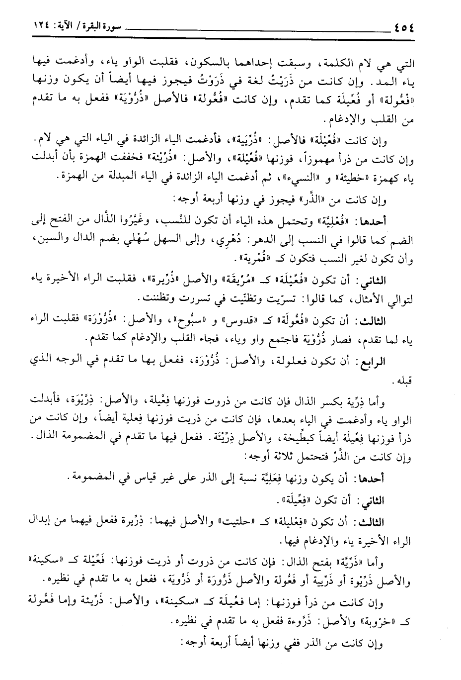 وإن كانت «فُعِّيْلَة» فالأصل «ذُرِّيَية» ، فأدغمت الياء الزائدة في الياء التي هي لام. وإن كانت من ذرأ مهموزاً، فوزنها، «فُعِّيْلة» ، والأصل: «ذُرِّيْئة» فخففت الهمزة بأن أبدلت ياء كهمزة «خطيئة» والنسيء «، ثم أدغمت الياء الزائدة في الياء المبدلة من الهمزة.