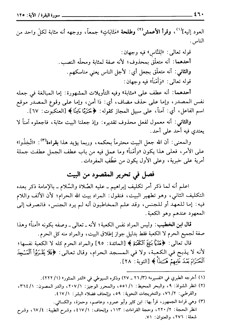 والمعنى: أن الله جعل البيت محترماً بحكمه، وربما يؤيد هذا بقرأءة:» اتَّخِذُوا «على الأمر، فعلى هذا يكون» وأَمْناً «وما عمل فيه من باب عطف الجمل عطفت جملة أمرية على خبرية، وعلى الأول يكون من عَطْفِ المفردات.
