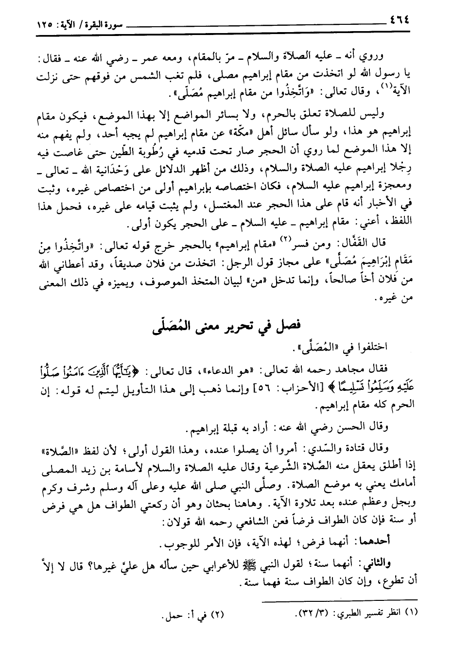 وقال قتادة والسّدي: أمروا أن يصلوا عنده، وهذا القول أولى؛ لأن لفظ «الصَّلاة» إذا أطلق يعقل منه الصَّلاة الشَّرعية وقال عَلَيْهِ الصَّلَاة وَالسَّلَام ُ لأسامة بن زيد المصلى أمامك يعني به موضع الصلاة. وصلَّى النبي صَلَّى الله عَلَيْهِ وَسَلَّم َ وعلى آله وسلم وشرف وكرم وبجل وعظم عنده بعد تلاوة الآية. وهاهنا بحثان وهو أن ركعتي الطواف هل هي فرض أو سنة فإن كان الطواف فرضاً فعن الشافعي رَحِمَهُ اللهُ قولان: