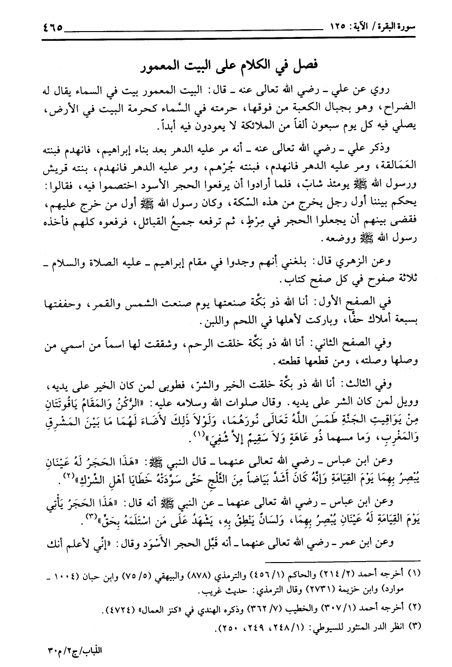 روي عن علي رضي الله تعالى عنه قال: البيت المعمور بيت في السماء يقال له الضراح، وهو بجال الكعبة من فوقها، حرمته في السَّماء كحرمة البيت في الأرض، يصلي فيه كل يوم سبعون ألفاً من الملائكة لا يعودون فيه أبداً.