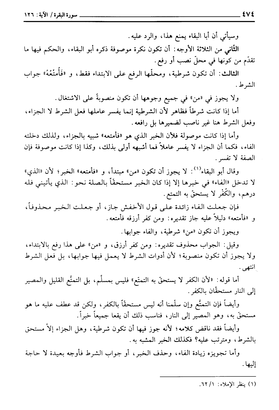 وقال أبو البقاء: لايجوز أن تكون «من» مبتدأ، و «فأمتعه» الخبر؛ لأن «الذي» لا تدخل «الفاء» في خبرها إلا إذا كان الخبر مستحقاً بالصلة نحو: الذي يأتينين فله درهم، والكُفْر لا يستحقّ به التمتع.
