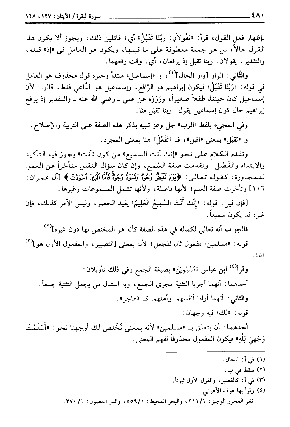 والثَّاني: الواو [واو الحال] ، و «إسماعيل» مبتدأ وخبره قول محذوف هو العامل في قوله: «رَبَّنَا تَقَبَّلْ» فيكون إبراهيم هو الرَّافع، وإسماعيل هو الدَّاعي فقط، قالوا: لأن إسماعيل كان حينئذ طفلاً صغيراً، ورَوَوْه عن علي رَضِيَ اللهُ عَنْه والتقدير إذ يرفع إبراهيم حال كون إسماعيل يقول: ربنا تقبل منّا.