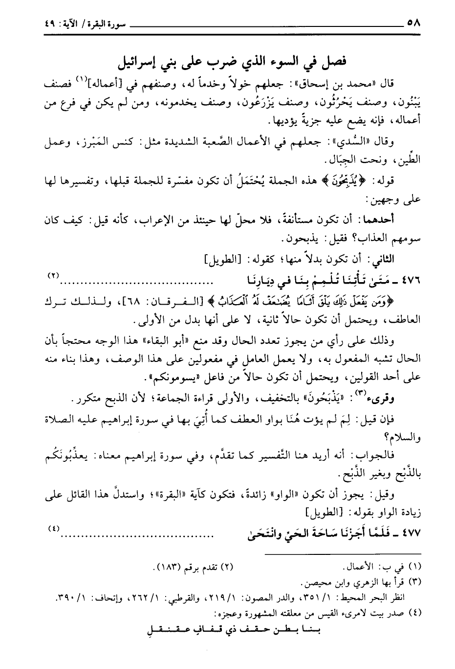 قوله: {يُذَبِّحُونَ} هذه الجملة يُحْتَمَلُ أن تكون مفسّرة للجملة قبلها، وتفسيرها لها على وجهين: