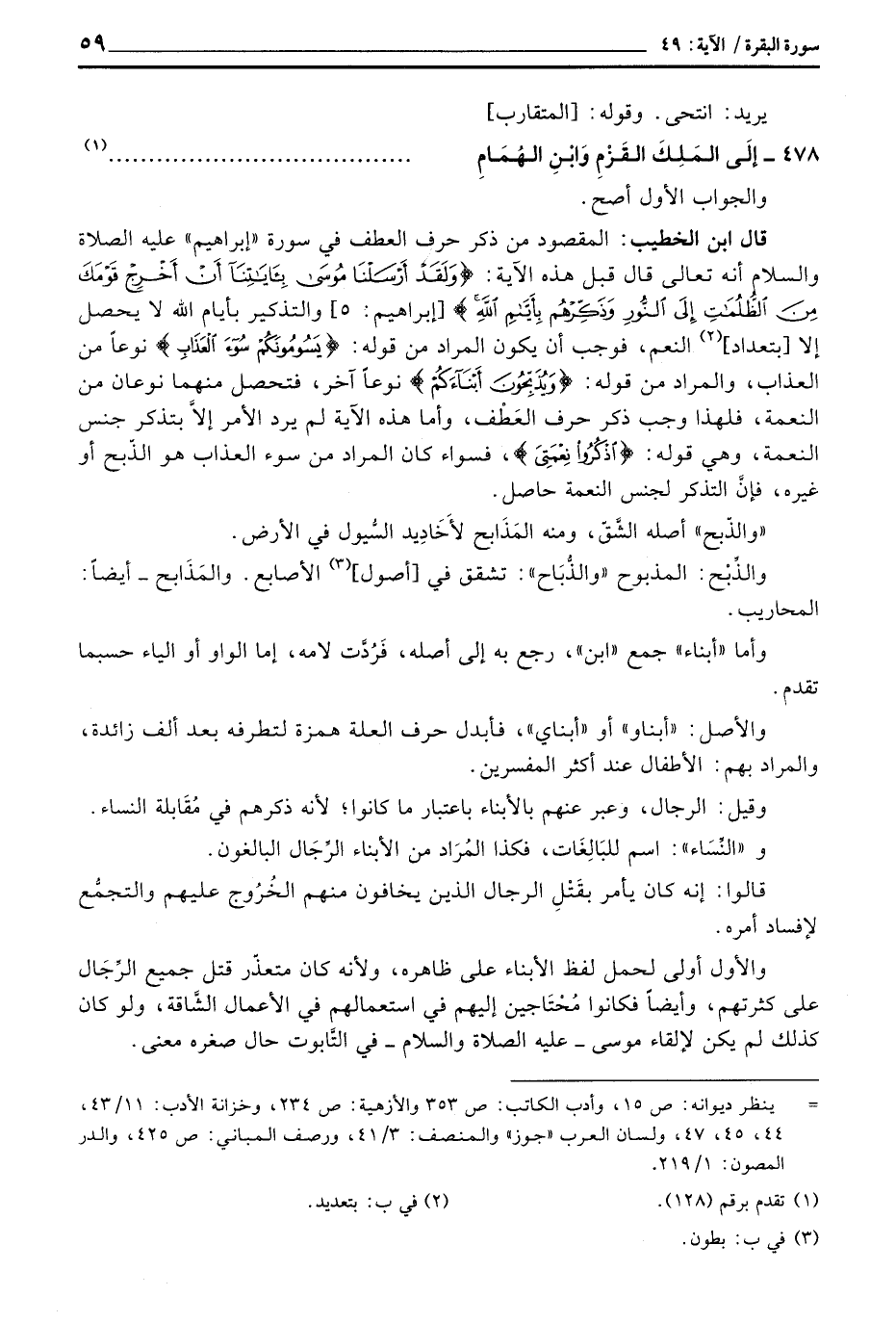 قل ابن الخطيب: المقصود من ذكر العطف في سورة «إبراهيم» عَلَيْهِ الصَّلَاة وَالسَّلَام ُ أنه تعالى قال قبل هذه الآية: {وَلَقَدْ أَرْسَلْنَا موسى بِآيَاتِنَآ أَنْ أَخْرِجْ قَوْمَكَ مِنَ الظلمات إِلَى النور وَذَكِّرْهُمْ بِأَيَّامِ الله} [إبراهيم: 5] والتذكير بأيام الله لا يصحل إلا [بتعدد] النعم، فوجب أن يكون المراد من قوله: {يَسُومُونَكُمْ سواء العذاب} نوعاً من العذاب، والمارد من قوله: {يُذَبِّحُونَ أَبْنَآءَكُمْ} نوعاً آخر، فتحصل منهما نوعان من النعمة، فلهذا وجب ذكر حرف العَطْف، وأما هذه الآية لم يرد الأمر إلاَّ بتذكر جنس النعمة، وهي قوله: {اذكروا نِعْمَتِي} [البقرة: 47] ، فسواء كان المراد من سوء العذاب هو الذّبح أو غيره، فإنَّ التذكير لجنس النعمة حاصل.