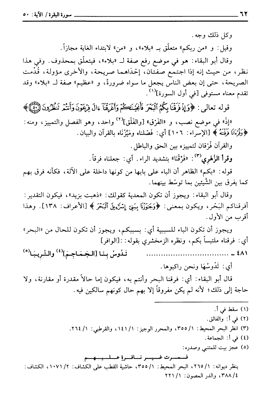 ويجوز أن تكن الباء للسببية أي: بسببكم، ويجوز أن تكون للحال من «البحر» أيك فرقناه ملتبساً بكم، ونظره الزمخشري بقوله: [الوافر]