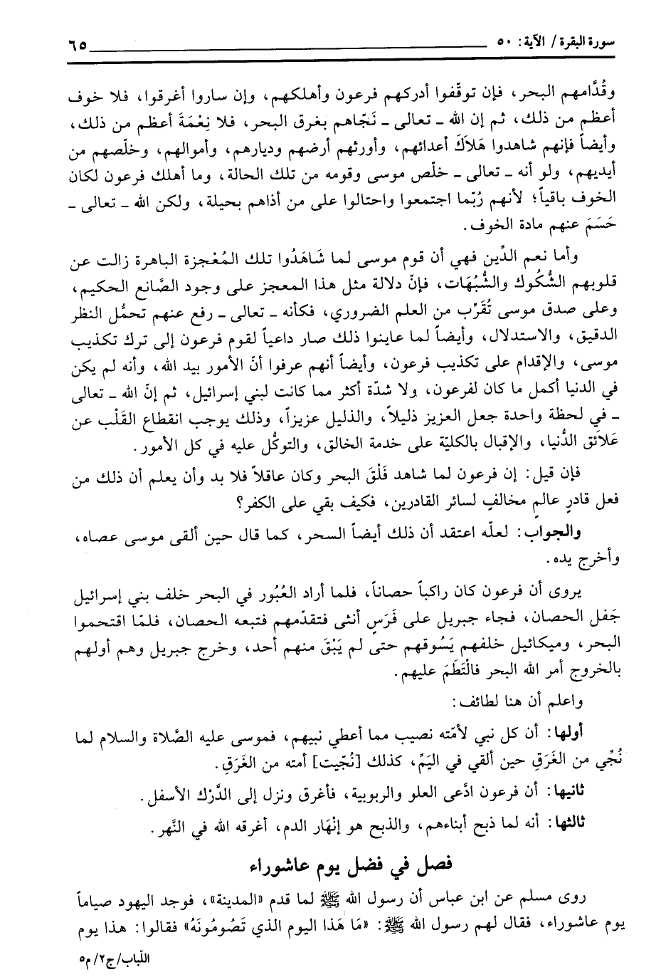 أولها: أن كل نبي لأمّته نصيب مما أعطي نبيهم، فموسى عليه الصَّلاة السلام لما نُجِّي من الغَرَقِ حين ألقي في اليَمِّ، كذلك [نُجّيت] أمته من الغَرَقِ.