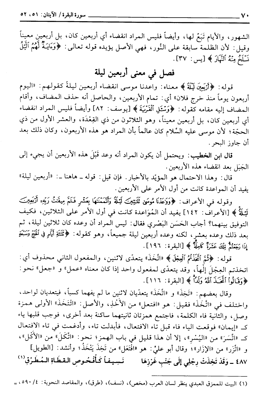 قوله: {أَرْبَعِينَ لَيْلَةً} معناه: واعدنا موسى انقضاء أربعين ليلةً كقولهم: «اليوم أربعين يوماً منذ خروج فلان» أي: تمام الأربعين، والحاصل أنه حذف المضاف، وأقام المضاف إليه مقامه كقوله: {واسأل القرية} [يوسف: 82] وأيضاً فليس المراد انقضاء أي أربعين كان، بل أربعين معيناً، وهو الثلاثون من ذي القِعْدَة، والعشر الأول من ذي الحجّة؛ لأن موسى عليه السَّلام كان عالماً بأن المراد هو هذه الأربعون، وكان ذلك بعد أن جاوز البحر.