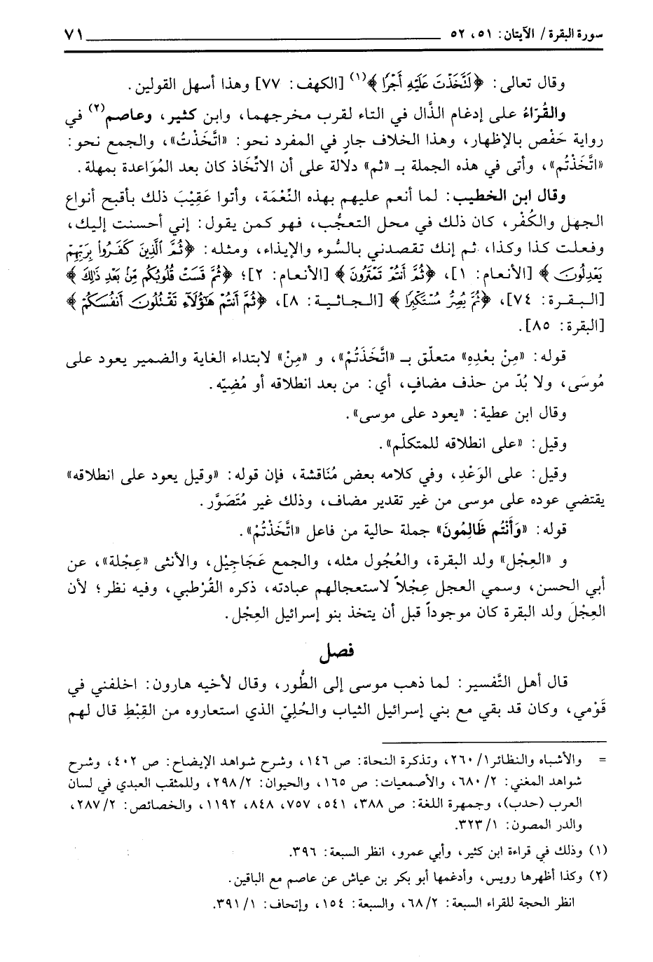 والقُرّاءُ على إدغام الذَّال في التاء لقرب مخرجهما، وابن كثير، وعاصم في رواية حَفْص بالإظهار، وهذا الخلاف جارٍ في المفرد نحو:» اتَّخَذْتُ «، والجمع نحو:» اتَّخَذْتُم «، وأتى في هذه الجملة ب» ثم «دلالة على أن الإتِّخَاذ كان بعد المُوَاعدة بمهلة.