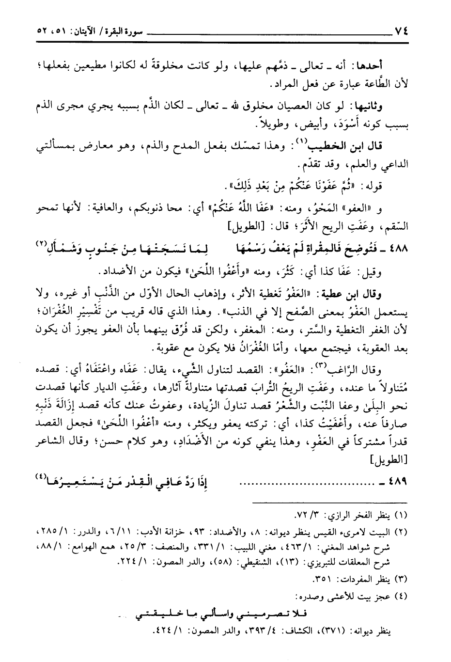 وقال الرَّاغب: «العَفُو» : القصد لتناول الشَّيء، يقال: عَفَاه واعْتَفَاهُ أي: قصده مُتَناولاً ما عنده، وعَفَتِ الريحُ التُّرابَ قصدتها متناولةً آثارها، وعَفَتِ الديار كأنها قصدت نحو البِلَى وعفا النَّبْت والشَّعْرُ قصد تناولَ الزِّيادة، وعفوتُ عنك كأنه قصد إِزَالَةَ ذَنْبِهِ صارفاً عنه، وأعْفَيْتُ كذا، أي: تركته يعفو ويكثر، ومنه «أعْفُوا اللِّحَى» فجعل القصد قدراً مشتركاً في العَفْوِ، وهذا ينفي كونه نم الأَضْدَادِن وهو كلام حسن؛ وقال الشاعر [الطويل]