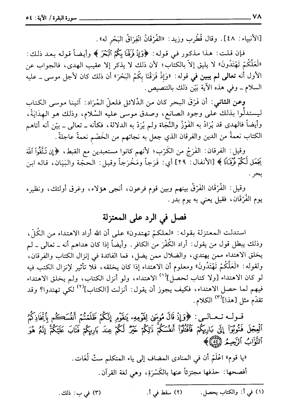 استدلت المعتزلة بقوله: «لعلكْم تهتدون» على أن الله أراد الاهتداء من الكُلّ، وذلك يبطل قول من يقول: أراد لكُفْرَ من الكافر. وأيضاً إذا كان هداهم أنه تعالى لم يخلق الاهتداء ممن يهتدي، والضلال ممن يضل، فما الفائدة في إنزال لكتاب والفرقان، ولقوله: «لَعَلَّكُمْ تَهْتَدُونَ» ومعلوم أن الاهتداء إذا كان يخلقه، فلا تأثير لإنزال الكتب فيه لو كان الاهتداء [ولا كتاب لحصل] الاهتداء ولو أنزل الكتاب، ولم يخلق الاهتداء فيهم لما حصل الاهتداء، فيكف يجوز أن يقول: أنزلت [الكتاب] لكي تهتدوا؟ وقد تقدّم مثل [هذا] الكلام.