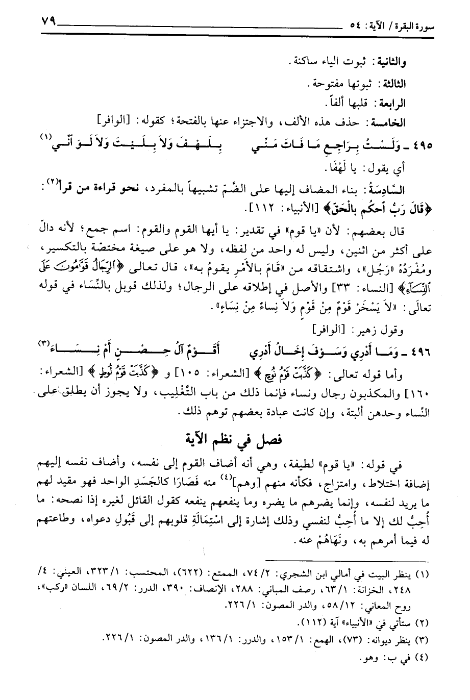 قال بعضهم: لأن «ياقوم» في تقدير: يا أيها القوم والقوم: سم جمع؛ لأنه دالّ على أكثر من اثنين، وليس له واحد من لفظه، ولا هو على صيغة مختصّة بالتكسير، ومُفْردُهُ «رَجُل» ، واشتقاقه من «قَامَ بالأَمرْرِ يقومُ به» ، قال تعالى: {الرجال قَوَّامُونَ عَلَى النسآء} [النساء: 34] والأصل في إطلاقه على الرجال؛ ولذلك قوبل بالنِّسَاء في قوله تعالى: {لاَ يَسْخَرْ قَوْمٌ مِّن قَوْمٍ عسى أَن يَكُونُواْ خَيْراً مِّنْهُمْ وَلاَ نِسَآءٌ مِّن نِّسَآءٍ} [الحجرات: 11] .