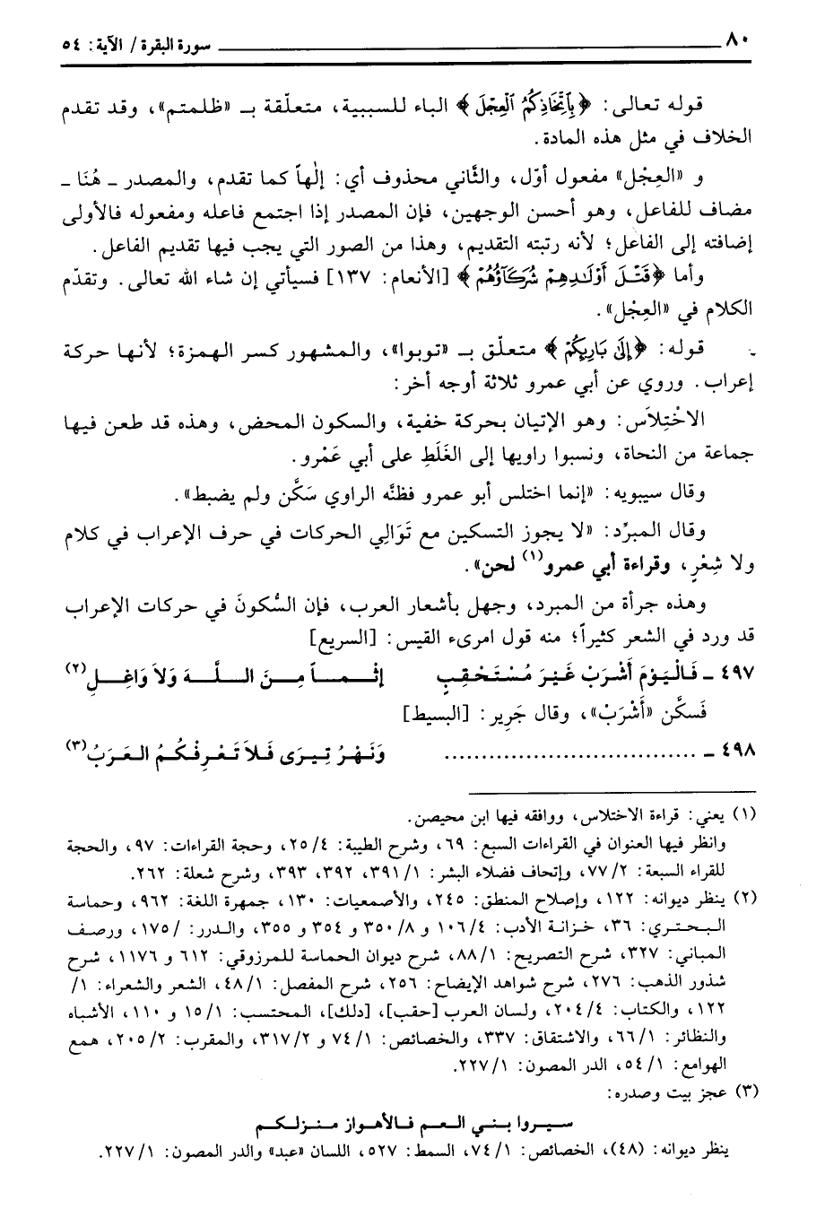 قوله: {إلى بَارِئِكُمْ} متعلّق ب «توبوا» ، والمشهور كسر الهمزة؛ لأنها حركة إعراب. وروي عن أبي عمرو ثلاثة أوجه أخر: