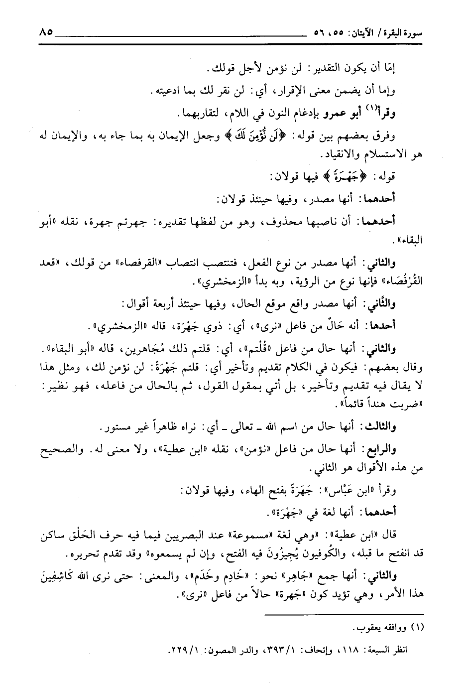 والثاني: أنها حال من فاعل «قُلْتم» ، أي: قلتم ذلك مُجَاهرين، قاله «أبو البقاء» . وقال بعضهم: فيكون في الكلام تقديم وتأخير أي: قلتم جَهْرَةً: لن نؤمن لك، ومثل هذا لا يقال فيه تقديم وتأخير، بل أتي بمقول القول، ثم بالحال من فاعله، فهو نظير: «ضربت هنداً قائماً» .