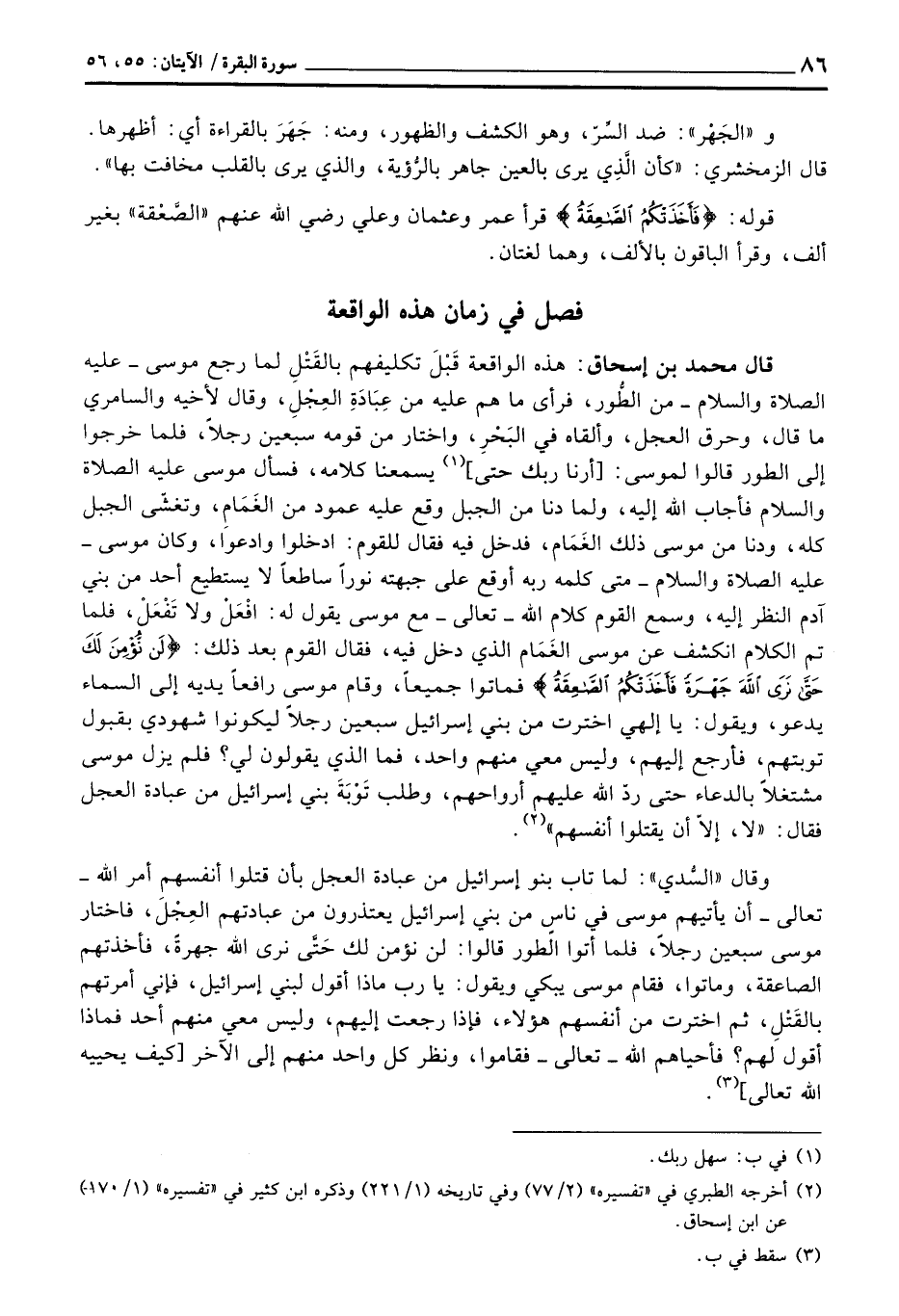 قال محمد بن إسحاق: هذه الواقعة قَبْلَ تكليفهم بالقَتْلِ لما رجع موسى عَلَيْهِ الصَّلَاة وَالسَّلَام ُ من الطُّور، فرأى ما همم عليه من عِبَادَةِ العِجْلِ، وقال لأخيه والسامري ما قال، وحرق العجل، وألقاه في البَحْرِ، واختار من قومه سبعين رجلاً، فلما خرجوا إلى الطور قالوا لموسى: [أرنا ربك حتى] يسمعنا كلامه، فسأل موسى عَلَيْهِ الصَّلَاة وَالسَّلَام ُ فأجاب الله إليه، ولما دنا من الجبل وقع عليه عمود من الغَمَامِ، وتغشّى الجبل كله، ودنا من موسى الغَمَام، فدخل فيه فقال للقوم: ادخلوا وادعوا، وكان موسى عَلَيْهِ الصَّلَاة وَالسَّلَام ُ متى كلمه ربه أوقع على جبهته نوراً ساطعاً لا يستطيع أحد من بني آدم النظر إليه، وسمع القوم كلام الله تعالى مع موسى يقول له: افْعَلْ ولاتَفْعَلْ، فلما تم الكلام انكشف عن موسى الغَمَام الذي دخل فيه، فقال القوم بعد ذلك: {لَن نُّؤْمِنَ لَكَ حتى نَرَى الله جَهْرَةً فَأَخَذَتْكُمُ الصاعقة} فماتوا جميعاً، وقام موسى رافعاً يديه إلى السماء يدعو، ويقول: يا إلهي اخترت بني إسرائيل سبعين رجلاً ليكونوا شهودي بقبول توبتهم، فأرجع إليهم، وليس معي منهم واحد، فما الذي يقولون لي؟ فلم يزل موسى مشتغلاً بالدعاء حتى ردّ الله عليه أرواحهم، وطلب تَوْبَةَ بني إسرائيل من عبادة العجل فقال: «لا، إلا أن يقتلوا أنفسهم» .