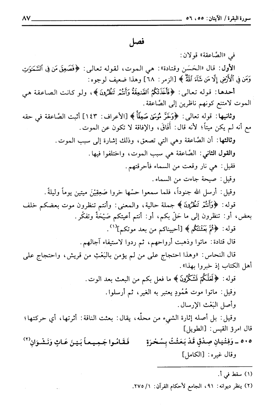 أحدها: قوله تعالى: {فَأَخَذَتْكُمُ الصاعقة وَأَنْتُمْ تَنظُرُونَ} ، ولو كانت الصاعقة هي الموت لا متنع كونه ناظرين إلى الصَّاعقة.