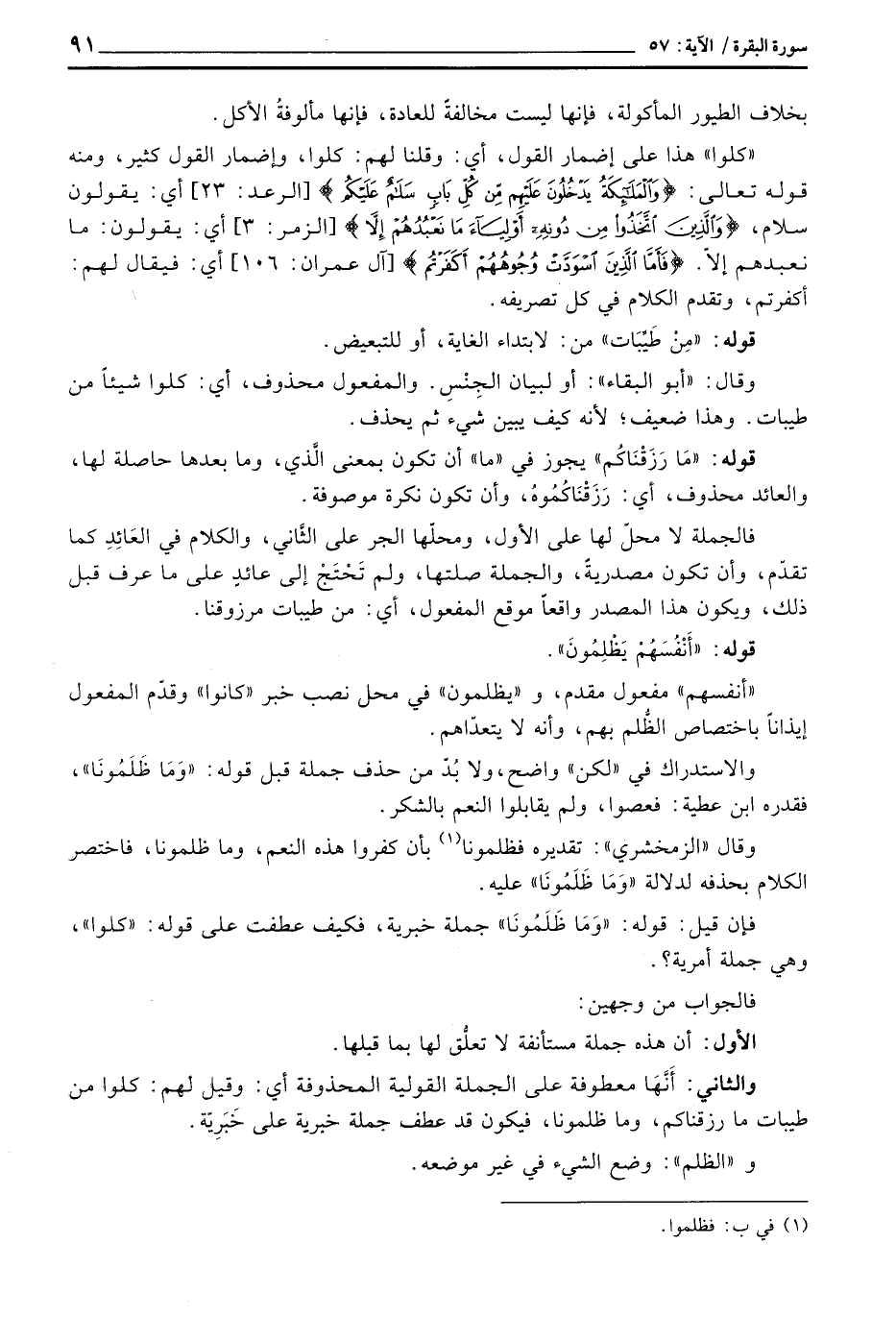 والثاني: أَنَّهَا معطوفة على الجملة القولية المحذوفة أي: وقيل لهم: كلوا من طيبات ما رزقناكم، وما ظلمونا، فيكون قد عطف جملة خبرية على خَبَرِيّة.