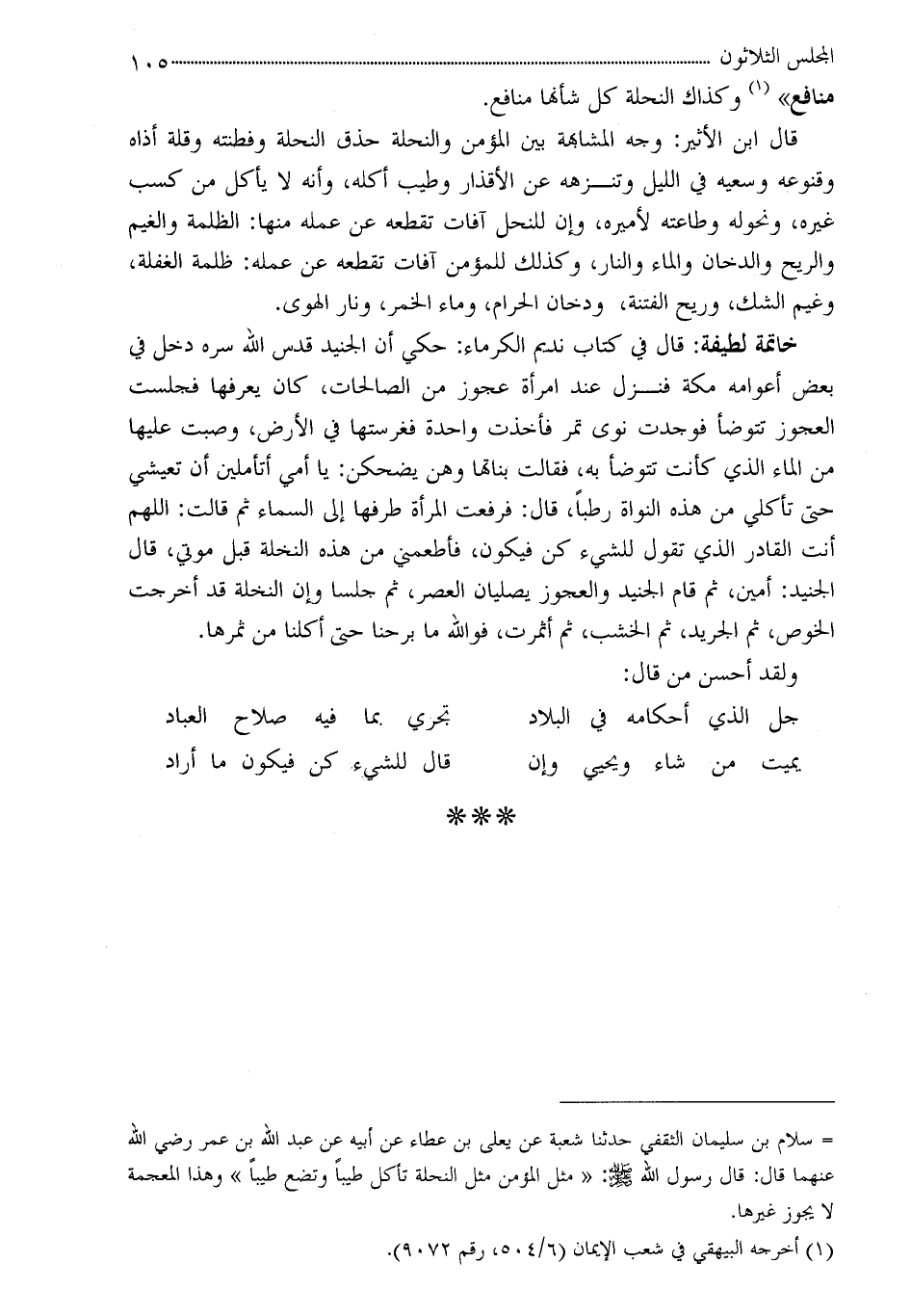 خاتمة لطيفة: قال في كتاب نديم الكرماء: حكي أن الجنيد قدس الله سره دخل في بعض أعوامه مكة فنزل عند امرأة عجوز من الصالحات، كان يعرفها فجلست العجوز تتوضأ فوجدت نوى تمر فأخذت واحدة فغرستها في الأرض، وصبت عليها من الماء الذي كأنت تتوضأ به، فقالت بناتها وهن يضحكن: يا أمي أتأملين أن تعيشي حتى تأكلي من هذه النواة رطباً، قال: فرفعت المرأة طرفها إلى السماء ثم قالت: اللهم أنت القادر الذي تقول للشيء كن فيكون، فأطعمني من هذه النخلة قبل موتي، قال الجنيد: أمين، ثم قام الجنيد والعجوز يصليان العصر، ثم جلسا وإن النخلة قد أخرجت الخوص، ثم الجريد، ثم الخشب، ثم أثمرت، فوالله ما برحنا حتى أكلنا من ثمرها.