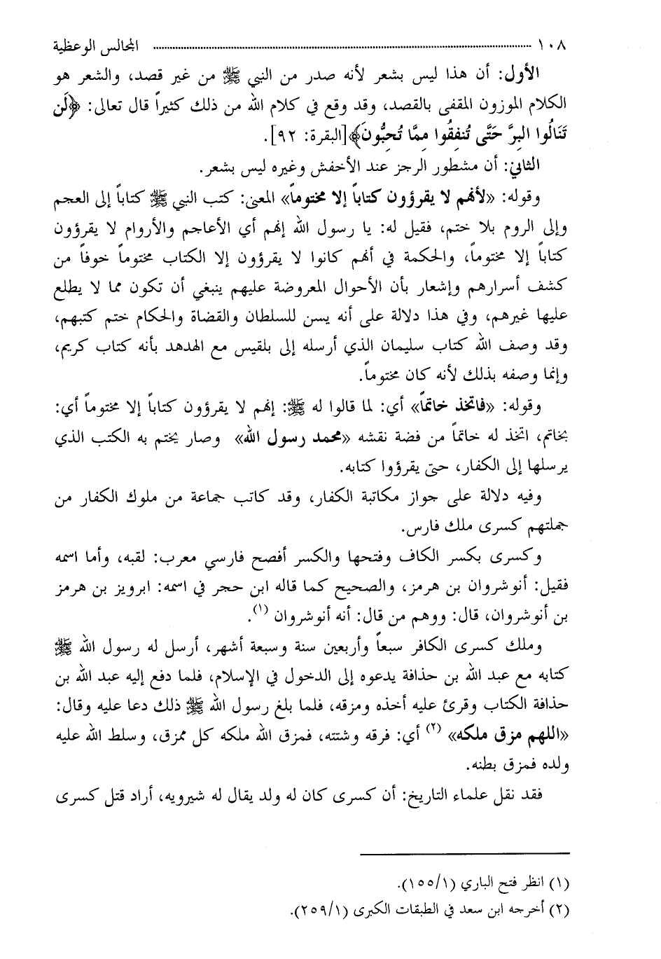 وقوله: «لأنهم لا يقرؤون كتاباً إلا مختوماً» المعنى: كتب النبي - صلى الله عليه وسلم - كتاباً إلى العجم وإلى الروم بلا ختم، فقيل له: يا رسول الله إنهم أي الأعاجم والأروام لا يقرؤون كتاباً إلا مختوماً، والحكمة في أنهم كانوا لا يقرؤون إلا الكتاب مختوماً خوفاً من كشف أسرارهم وأشعار بأن الأحوال المعروضة عليهم ينبغي أن تكون مما لا يطلع عليها غيرهم، وفي هذا دلالة على أنه يسن للسلطان والقضاة والحكام ختم كتبهم، وقد صف الله كتاب سليمان الذي أرسله إلى بلقيس مع الهدهد بأنه كتاب كريم، وإنما وصفته بذلك لأنه كان مختوماً.