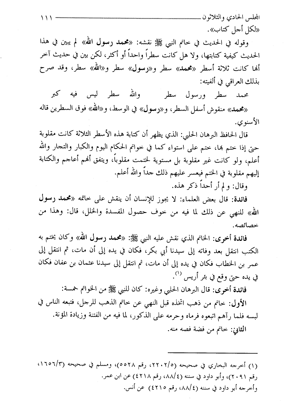 وقوله في الحديث في خاتم النبي - صلى الله عليه وسلم - نقشه: «محمد رسول الله» لم يبين في هذا الحديث كيفية كتابتها، ولا هل كانت سطراً واحداً أو أكثر، لكن بين في حديث آخر أنها كانت ثلاثة أسطر «محمد» سطر و «رسول» سطر و «الله» سطر، وقد صرح بذلك العراقي في ألفيته: