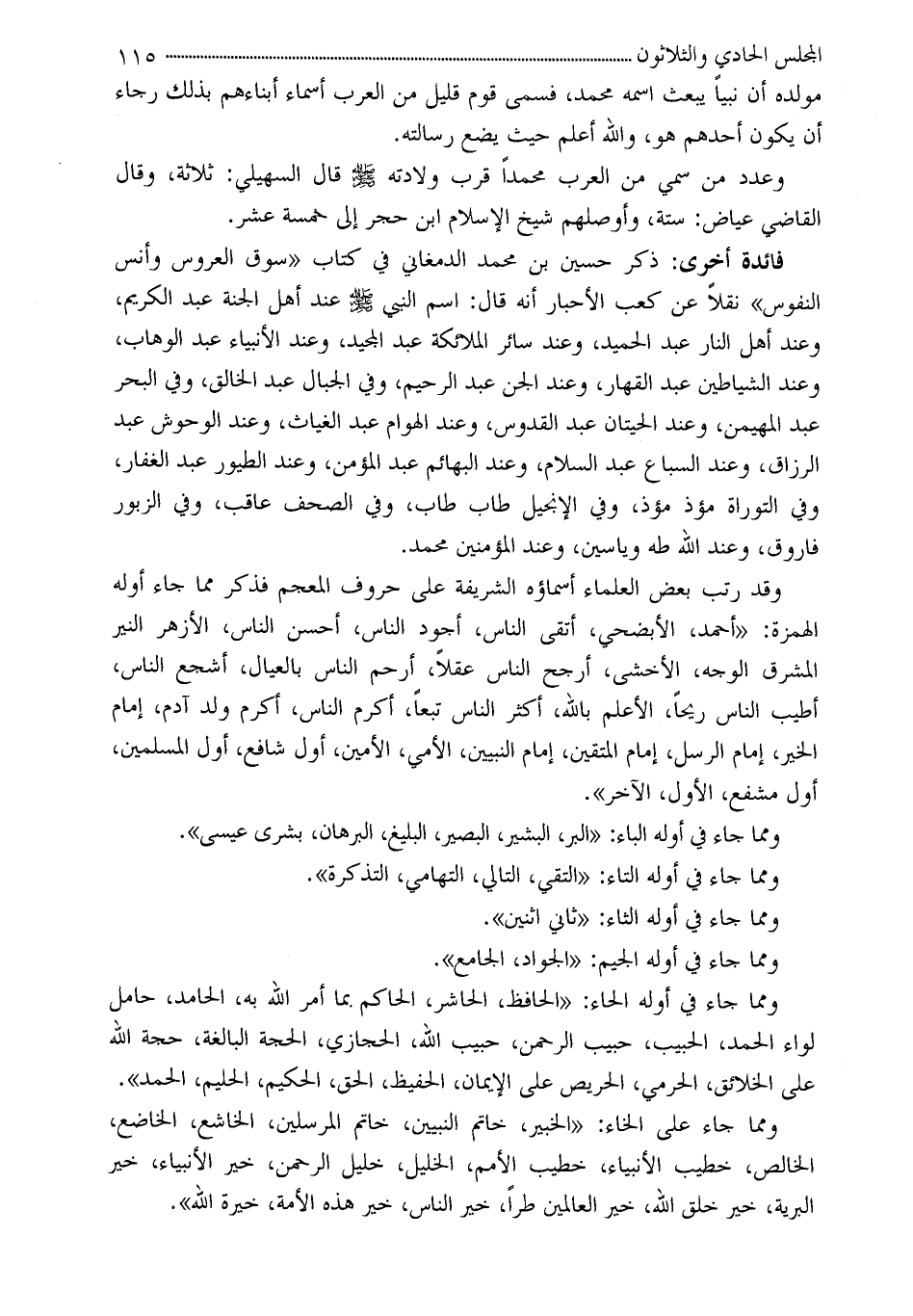 فائدة أخرى: ذكر حسين بن محمد الدمغاني في كتاب «سوق العروس وأنس النفوس» نقلاً عن كعب الأحبار أنه قال: اسم النبي - صلى الله عليه وسلم - عند أهل الجنة عبد الكريم، وعند أهل النار عبد الحميد، وعند سائر الملائكة عبد المجيد، وعند الأنبياء عبد الوهاب، وعند الشياطين عبد القهار، وعند الجن عبد الرحيم، وفي الجبال عبد الخالق، وفي البحر عبد المهيمن، وعند الحيتان عبد القدوس، وعند الهوام عبد الغياث، وعند الوحوش عبد الرزاق، وعند السباع عبد السلام، وعند البهائم عبد المؤمن، وعند الطيور عبد الغفار، وفي التوراة مؤذ مؤذ، وفي الإنجيل طاب طاب، وفي الصحف عاقب، وفي الزبور فاروق، وعند الله طه وياسين، وعند المؤمنين محمد.