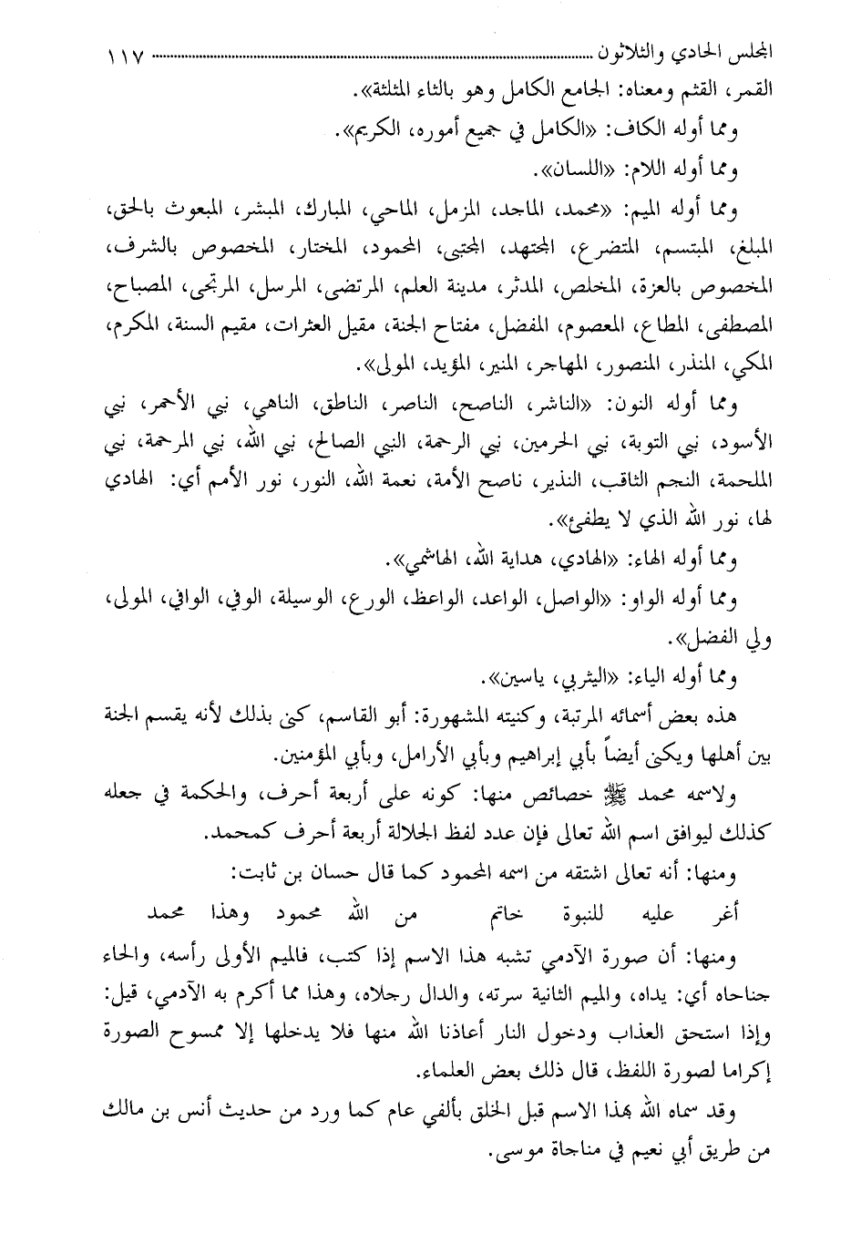 ومما أوله الميم: «محمد، الماجد، المزمل، الماحي، المبارك، المبشر، المبعوث بالحق، المبلغ، المبتسم، المتضرع، المجتهد، المجتبى، المحمود، المختار، المخصوص بالشرف، المخصوص بالعزة، المخلص، المدثر، مدينة العلم، المرتضى، المرسل، المرتجى، المصباح، المصطفي، المطاع، المعصوم، المفضل، مفتاح الجنة، مقيل العثرات، مقيم السنة، المكرم، المكي، المنذر، المنصور، المهاجر، المنير، المؤيد، المولى» .